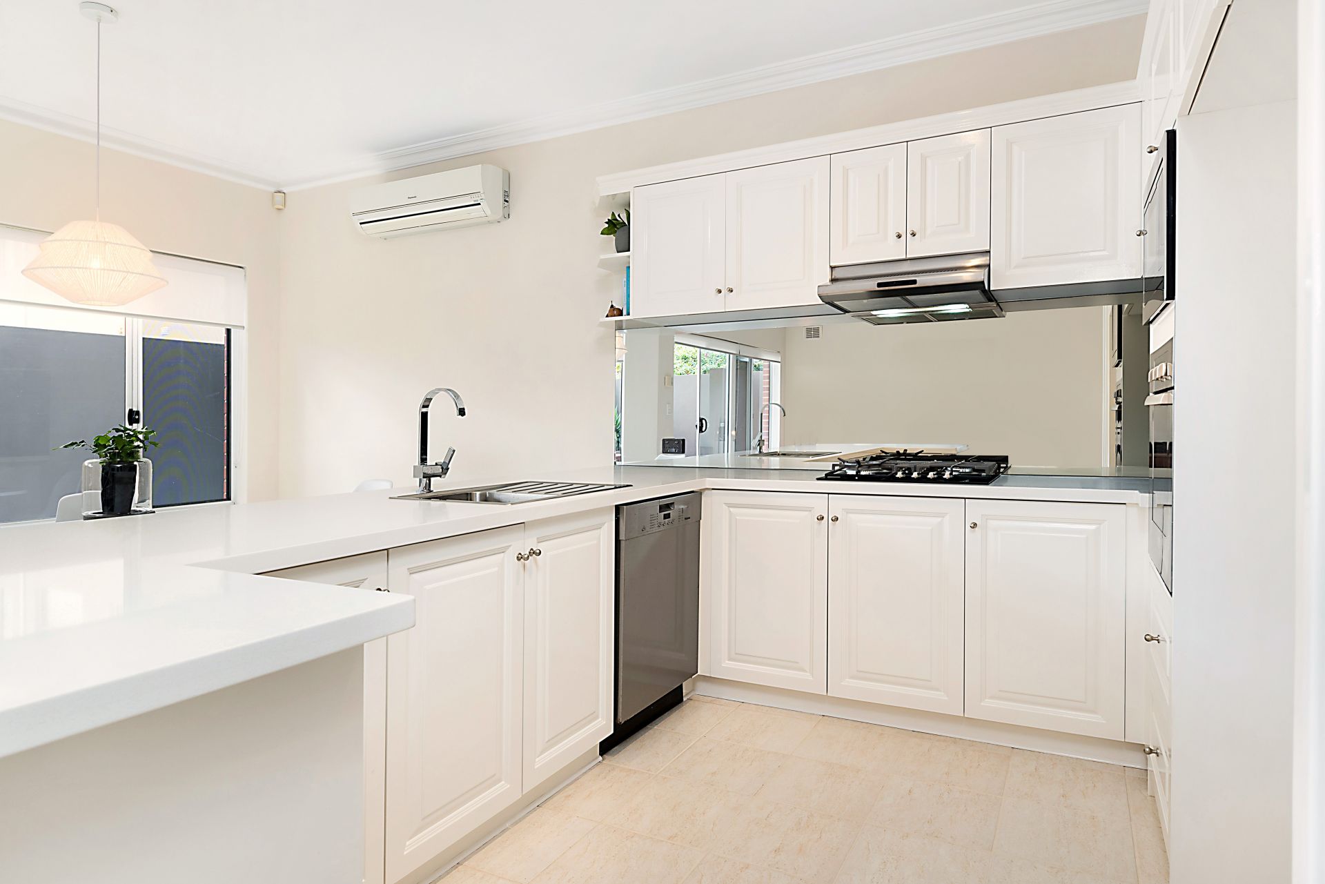 Designer kitchen with stone bench top, mirrored splash back, Miele dishwasher and huge walk in pantry