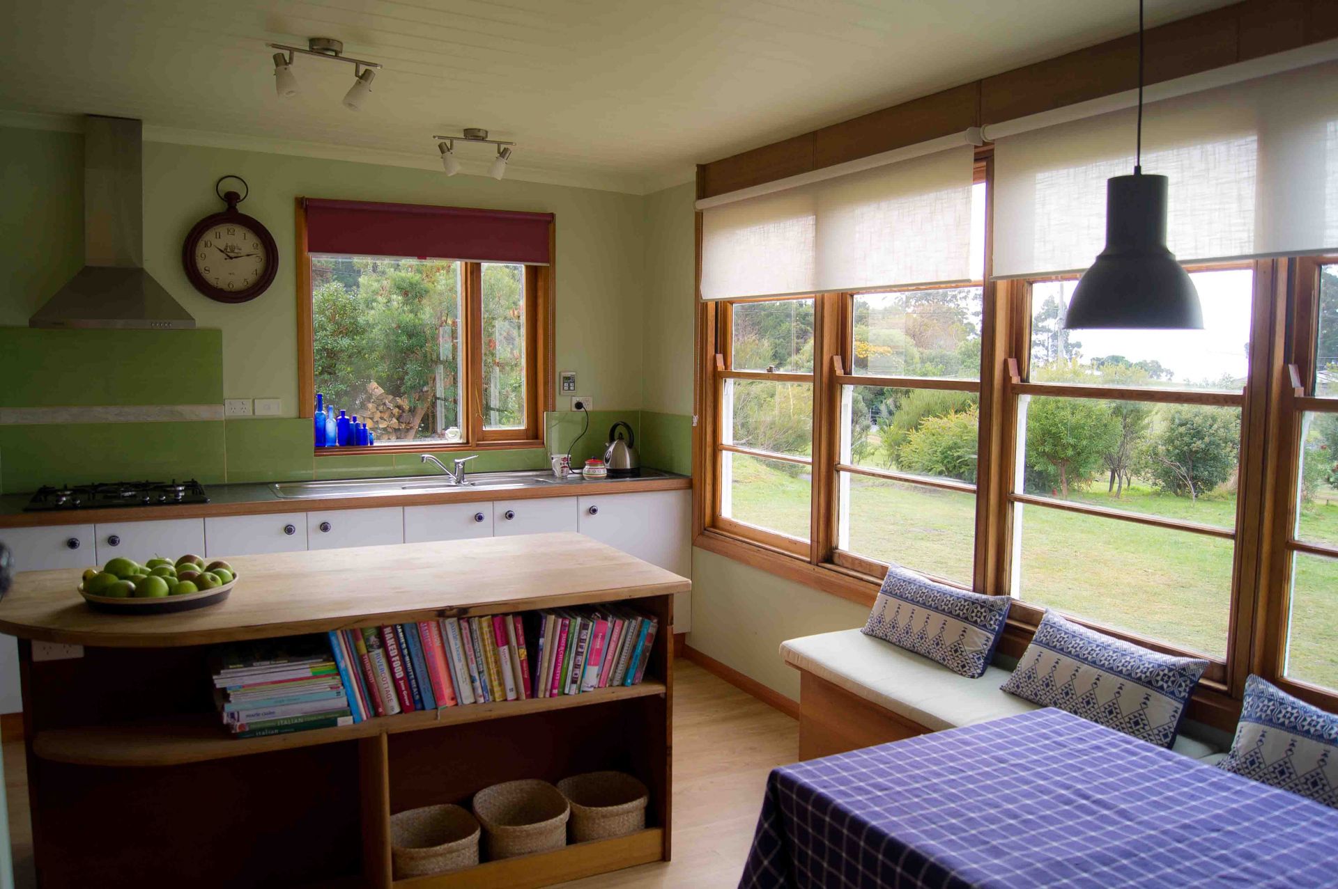 Watch the sun rise over Bruny Island and the D'entrecasteaux Channel from the East-facing feature window in the modern kitchen while cooking with the five burner gas top or electric wall oven.