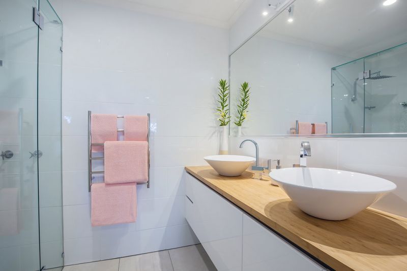 Ensuite features double bowled white 2 pac wall hung vanity with stunning bamboo bench top and spacious frameless shower with rain head.