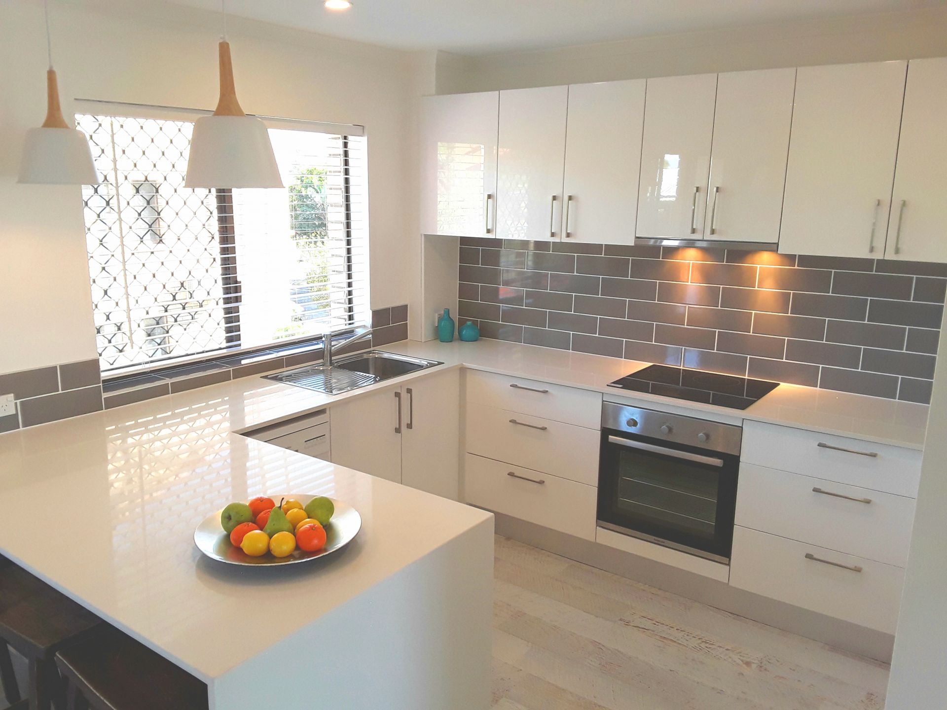 Brand new, white 2 pac kitchen consisting of many soft close drawers and pantry, lots of cupboards. Dishwasher, ss appliances and beautiful stone bench top and breakfast bar.