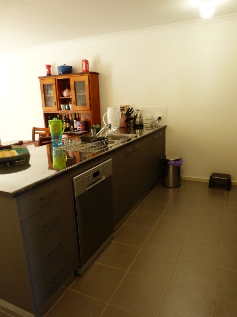 The house has a contemporary, wide width galley styled kitchen with stainless steel appliances (including dishwasher) and gallery style counter top.