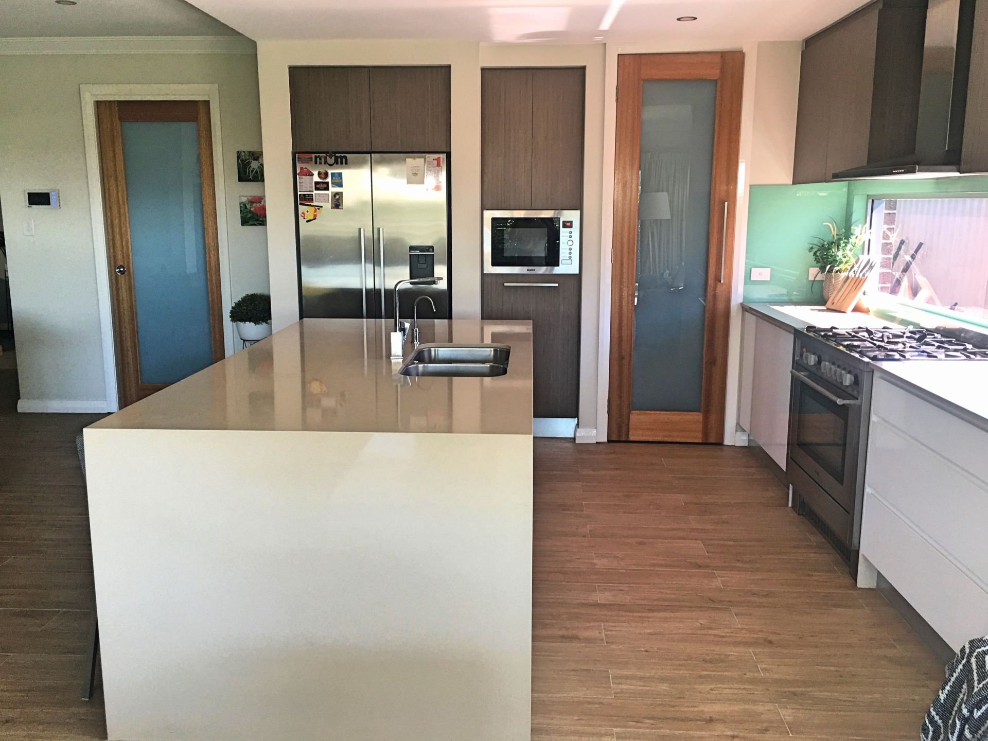 *Gourmet kitchen complete with walk in pantry, stone bench tops, Blanco appliances including a 900mm freestanding cooker, semi integrated dishwasher and integrated microwave, handle-less cabinetry with shark nose drawers, Hettich soft close draws and cupboard.