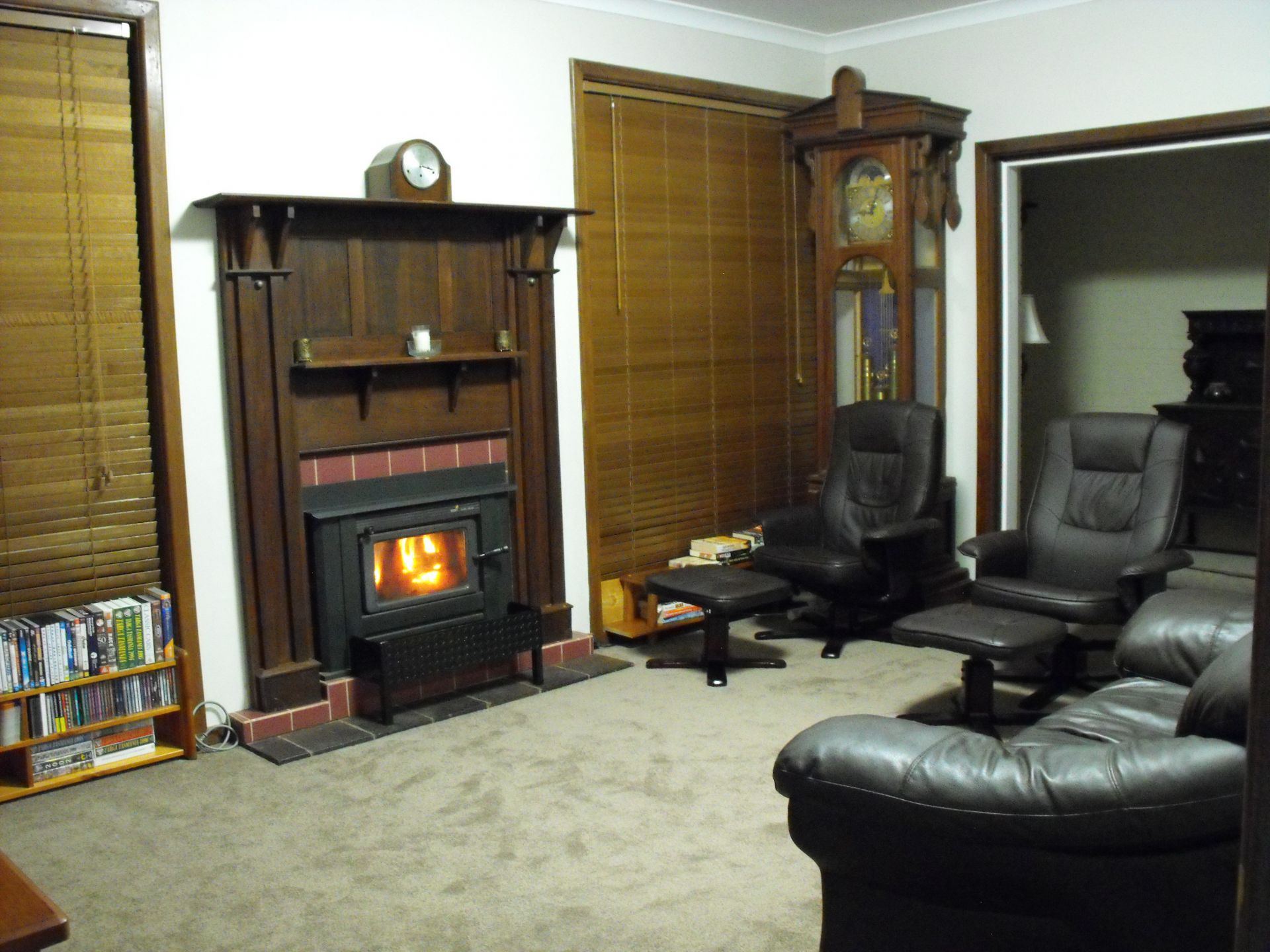 Large lounge room featuring antique jarrah fireplace surround with fan forced slow combustion fire, quality new carpet, floor to ceiling windows with timber venetians overlooking front garden. Two sets of French doors to close area for privacy.