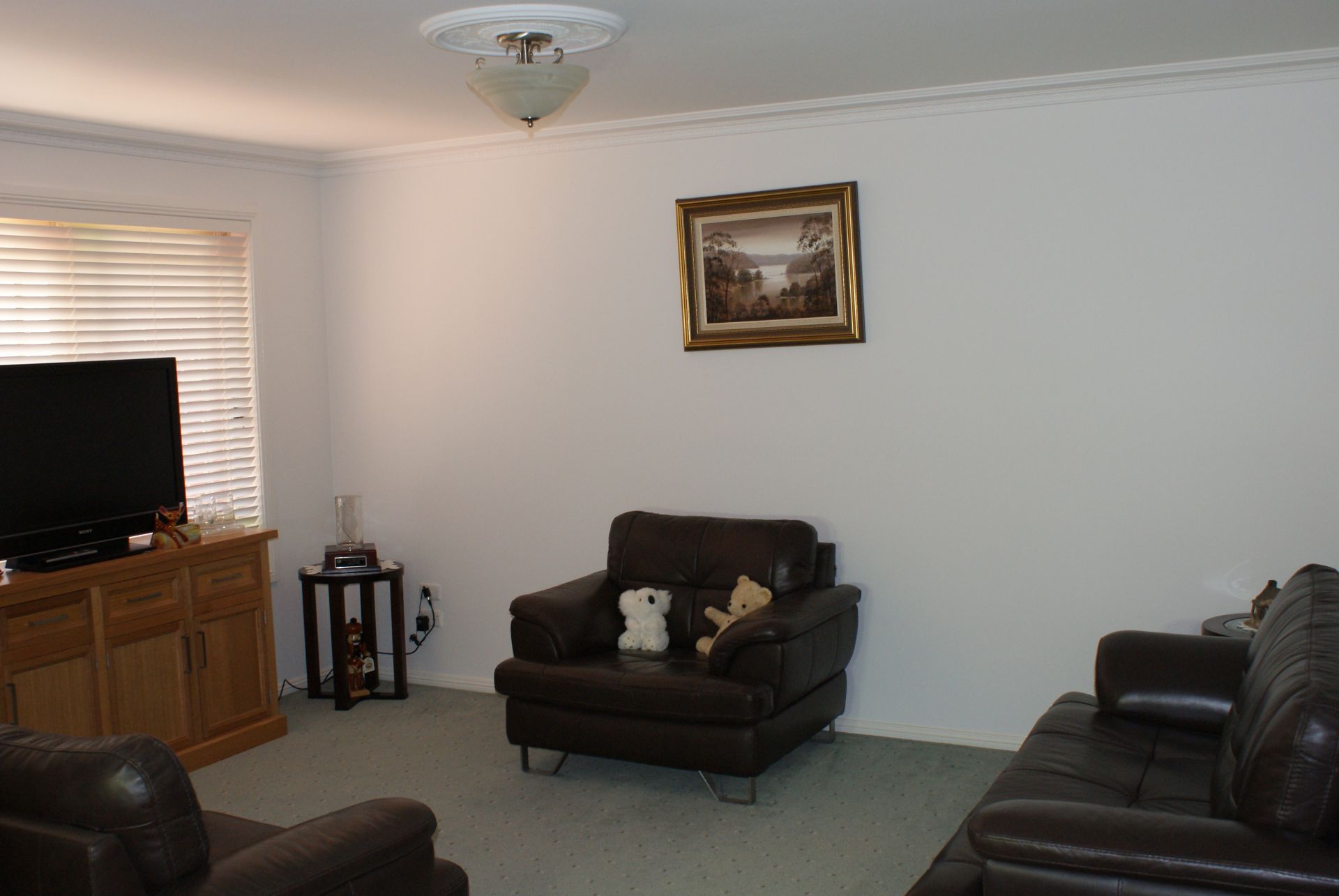 This home features a carpeted formal lounge room with ornate plaster cornices and light rose.