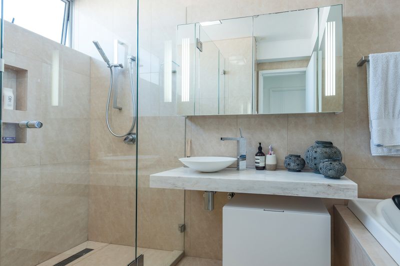 - A generous bathroom with 'floating' Minosa furniture and an oversized shower and spa bath