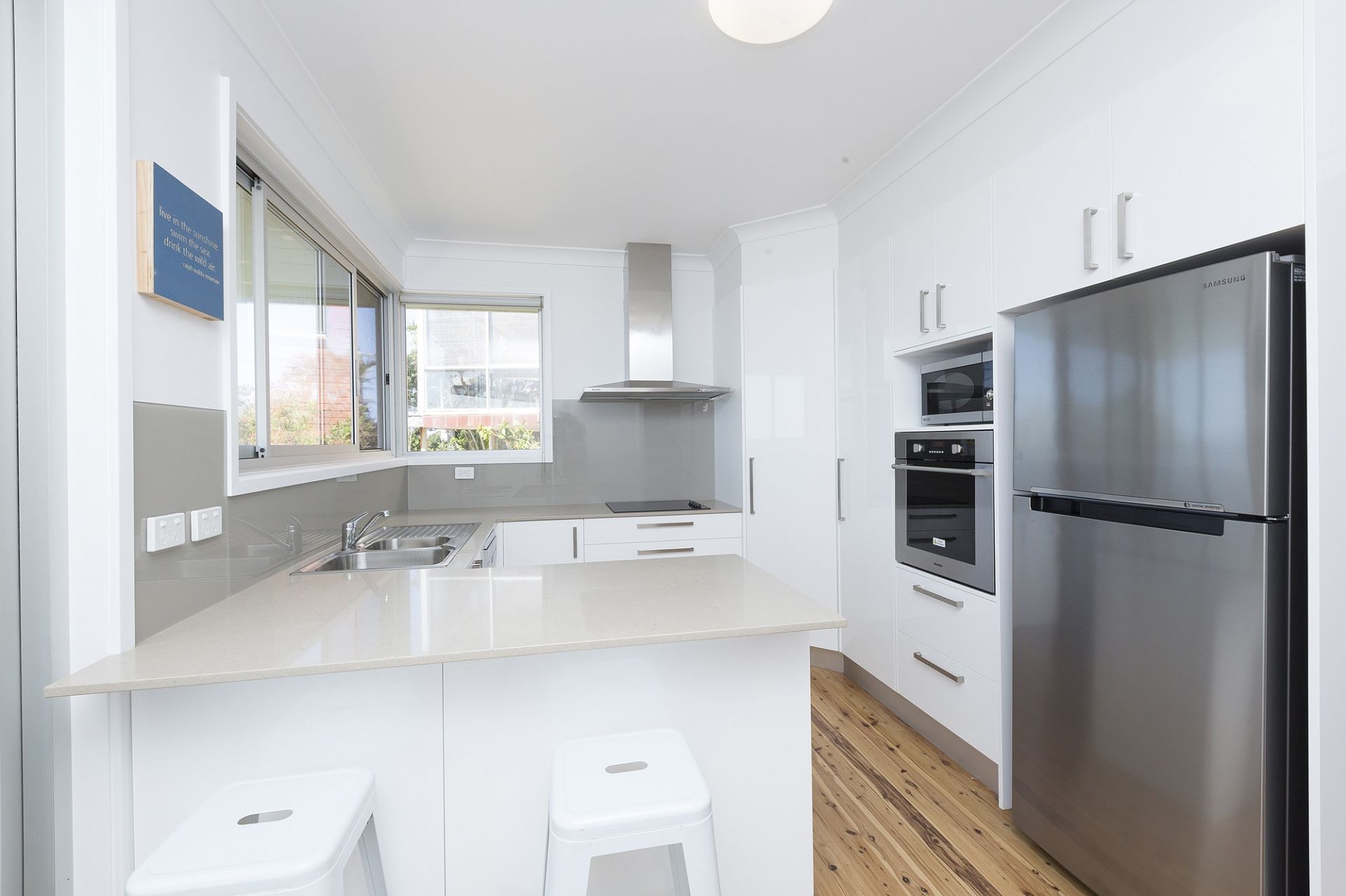 The brand new kitchen is sleek and stylish with Caesarstone benchtops, two-Pac gloss cabinetry and stainless steel Blanco appliances.