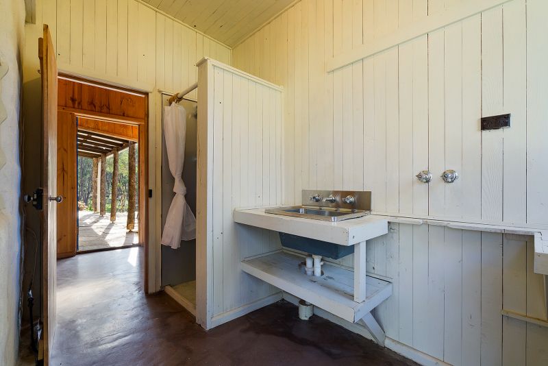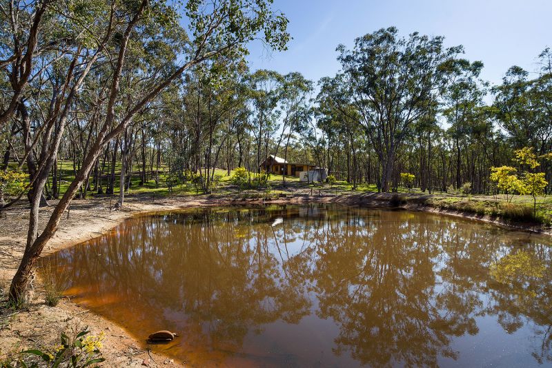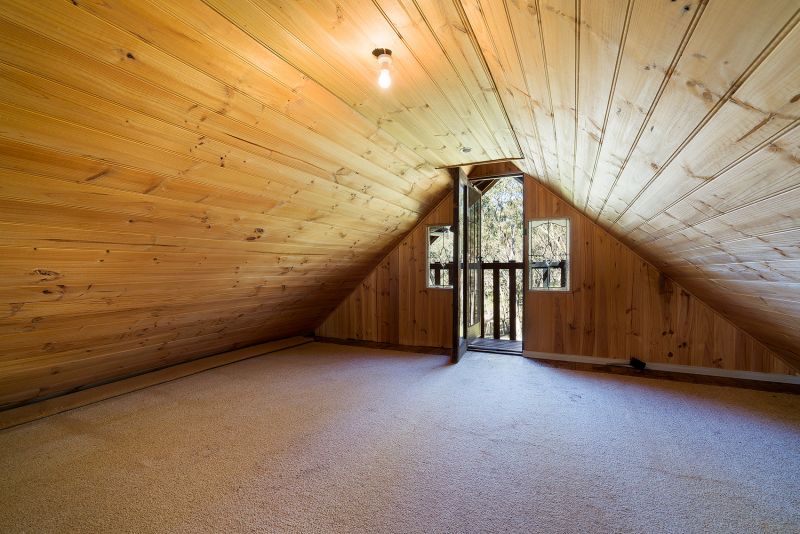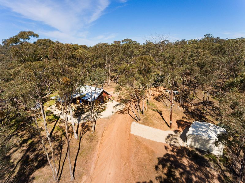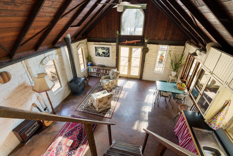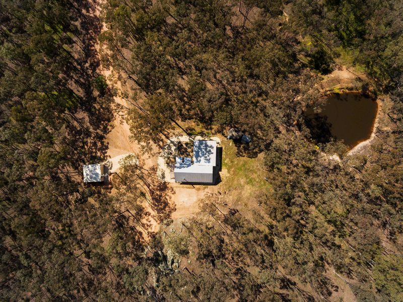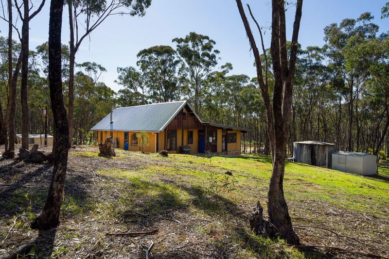 The house consists of a large open plan kitchen, dining and living room with high cathedral ceilings, 3 bedrooms, mezzanine/loft area, a bathroom with toilet and vanity, a laundry with shower, a study nook, and covered verandahs overlooking the surrounding forest. This character home has been hand built with love and care, well maintained, and improved. It has a great feel with plenty of natural light. There is a large separate shed/workshop/studio (~6x6m) as well as a small garden shed. The house is well situated, looking out over the nearby dam and forest. Beautiful rocky outcrops dot the land.