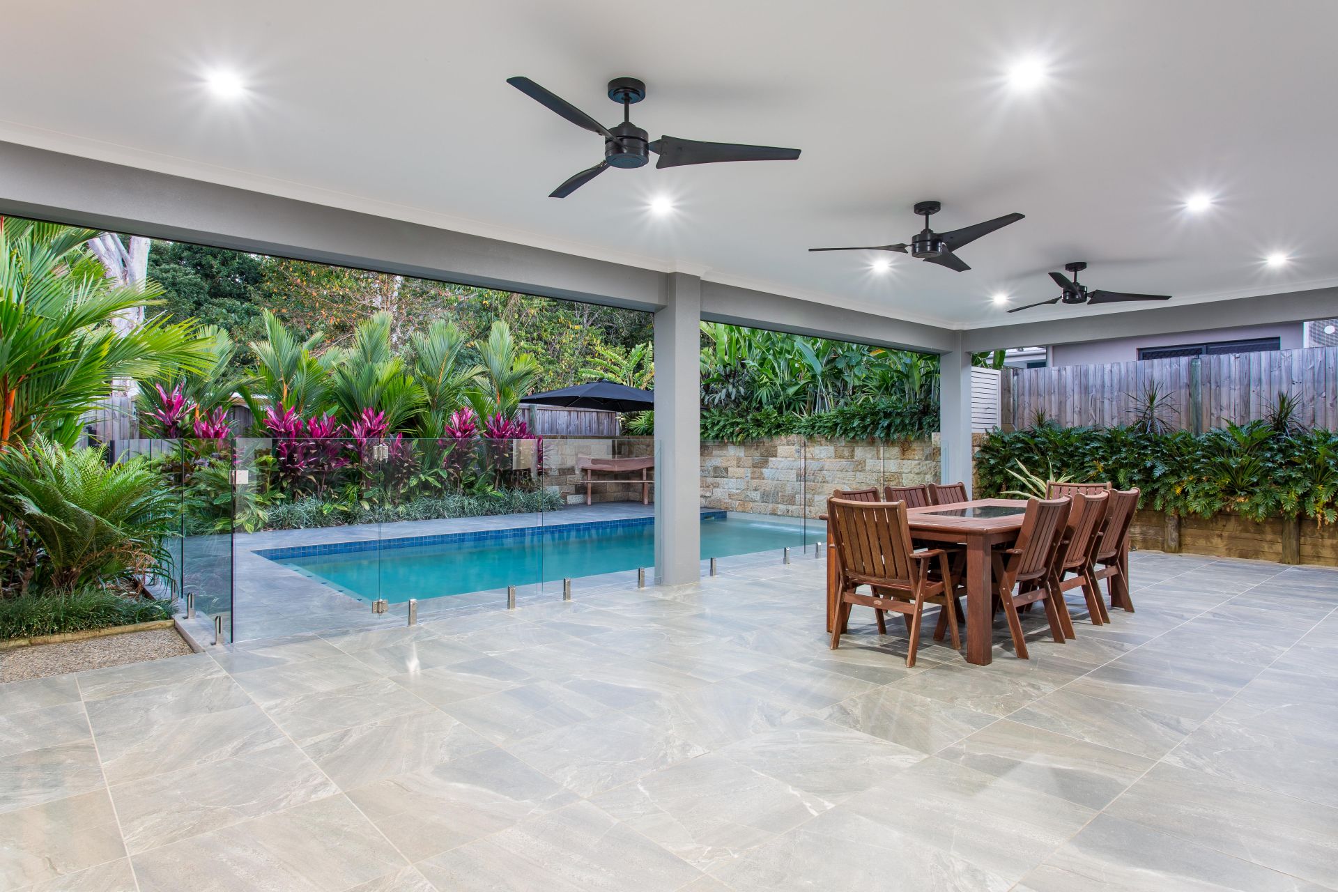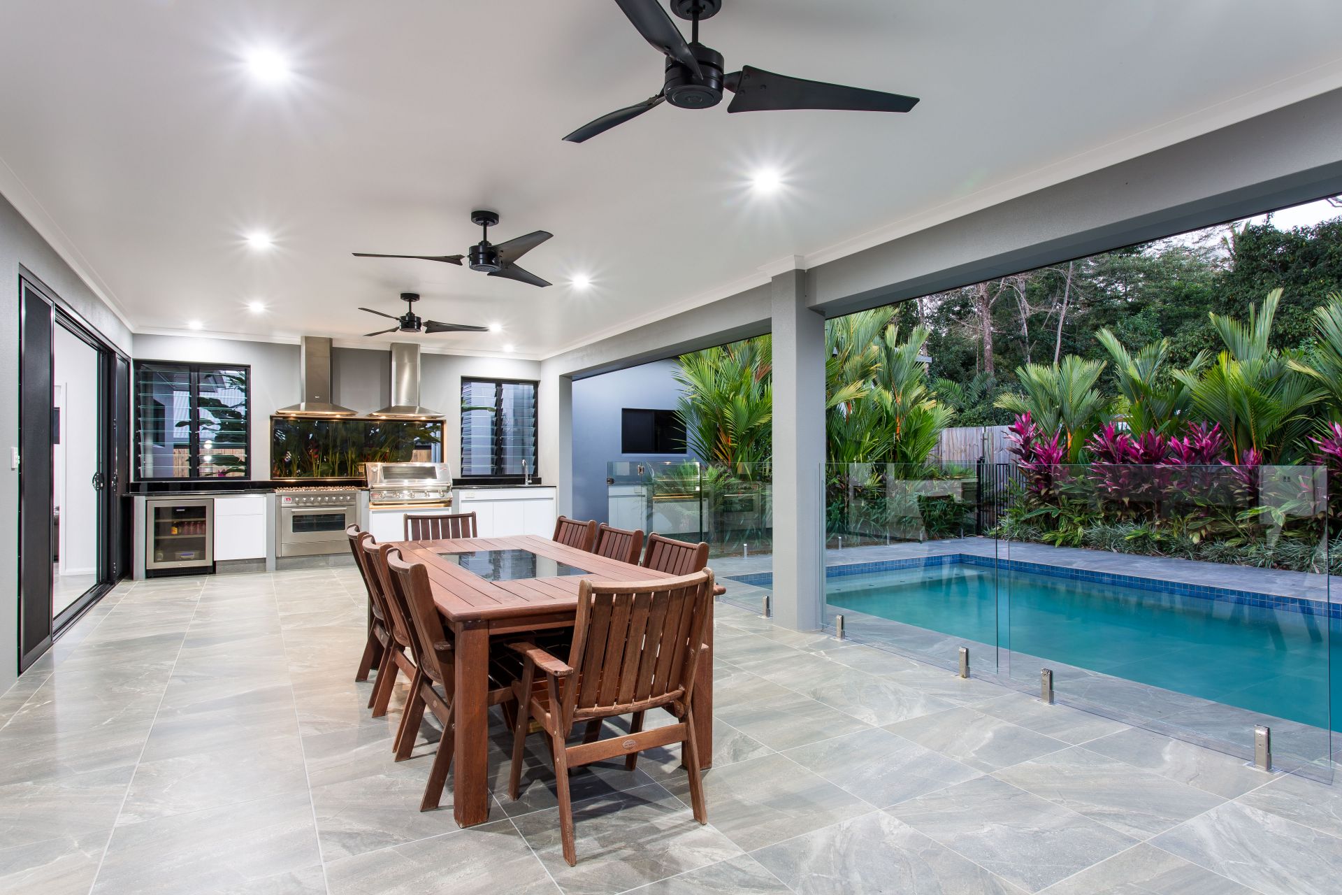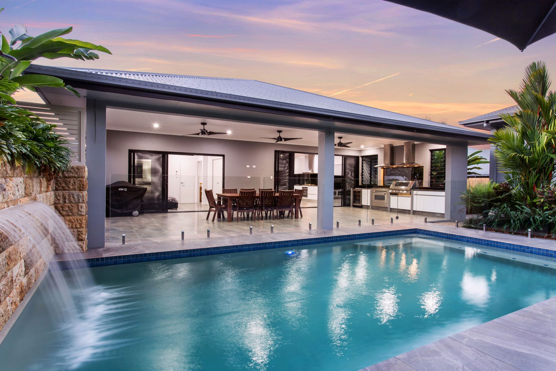 The home is designed for entertaining with its huge alfresco outdoor area and second kitchen fully equipped with full sized oven, built in BBQ and drinks fridge. All this set amid tropical gardens, a fresh water pool with waterfall and a bushland backdrop.
