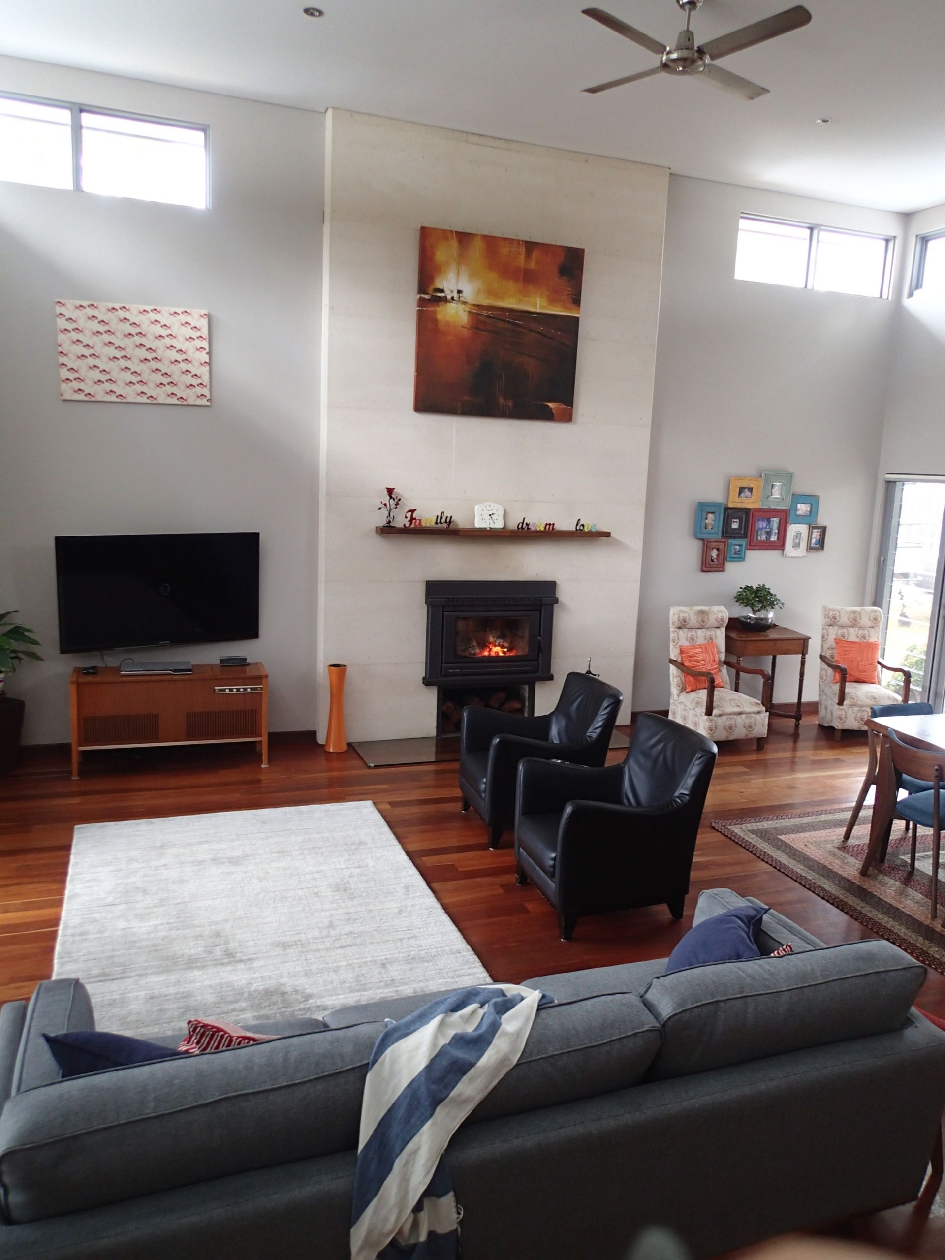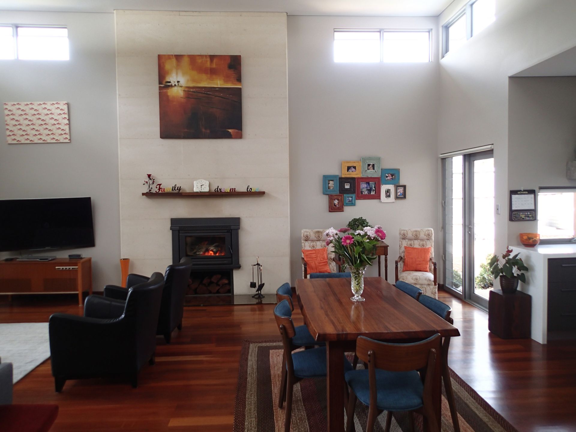 This skillion style build of home opens up to a large open plan living space with shadow line cornicing creating a modern feel to the home. With design of the home facing north, attention to detail has allowed electric opening windows in the living area to capture the heat in the winter months and the breeze in the summer months. The fireplace in the living area is built into the rammed earth wall which creates a unique winter ambience.