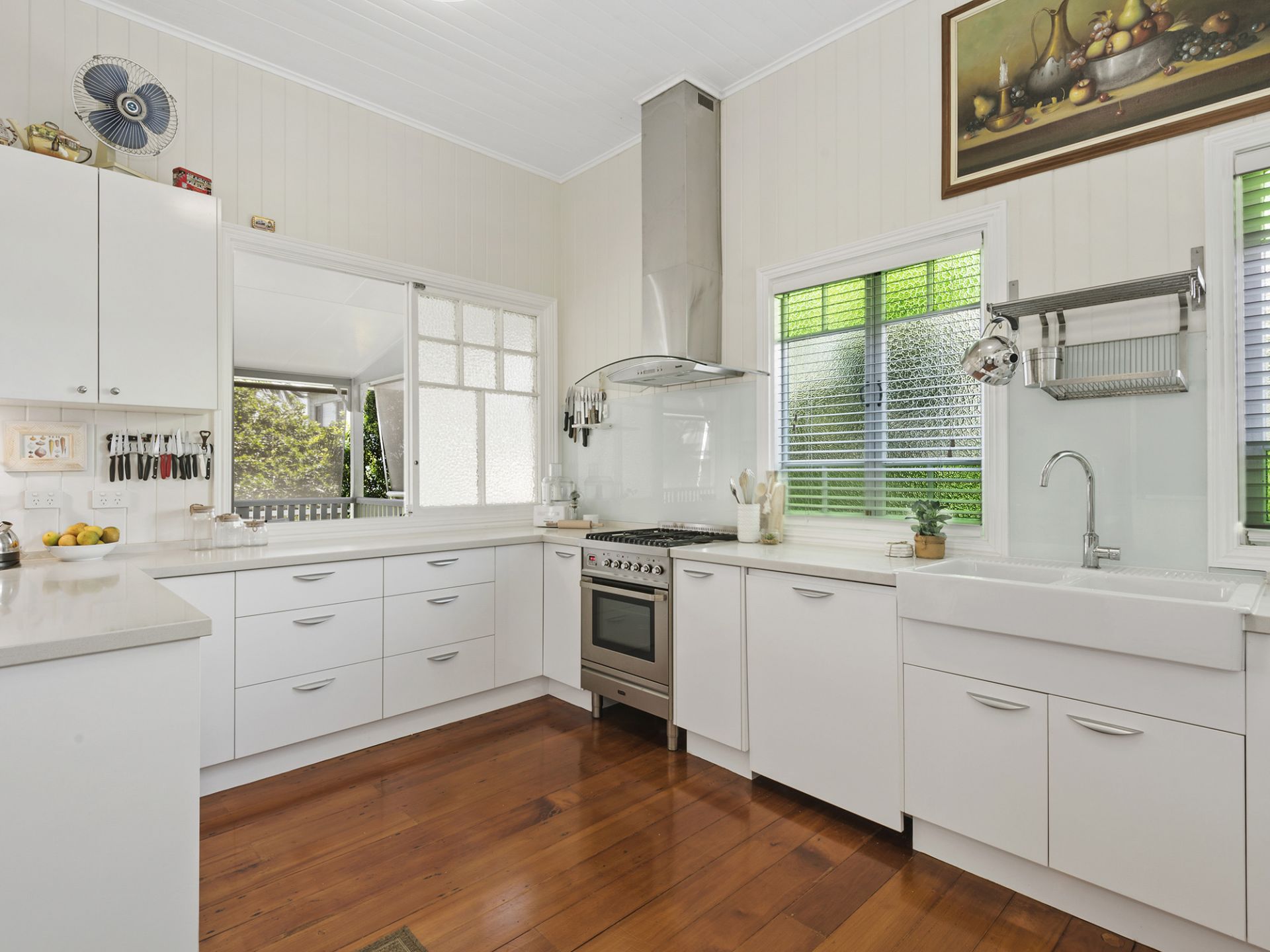 Double garage, storeroom and outside garden shed with rear lane automatic access and beautiful garden with lawns back and front, complete this picturesque house and location.