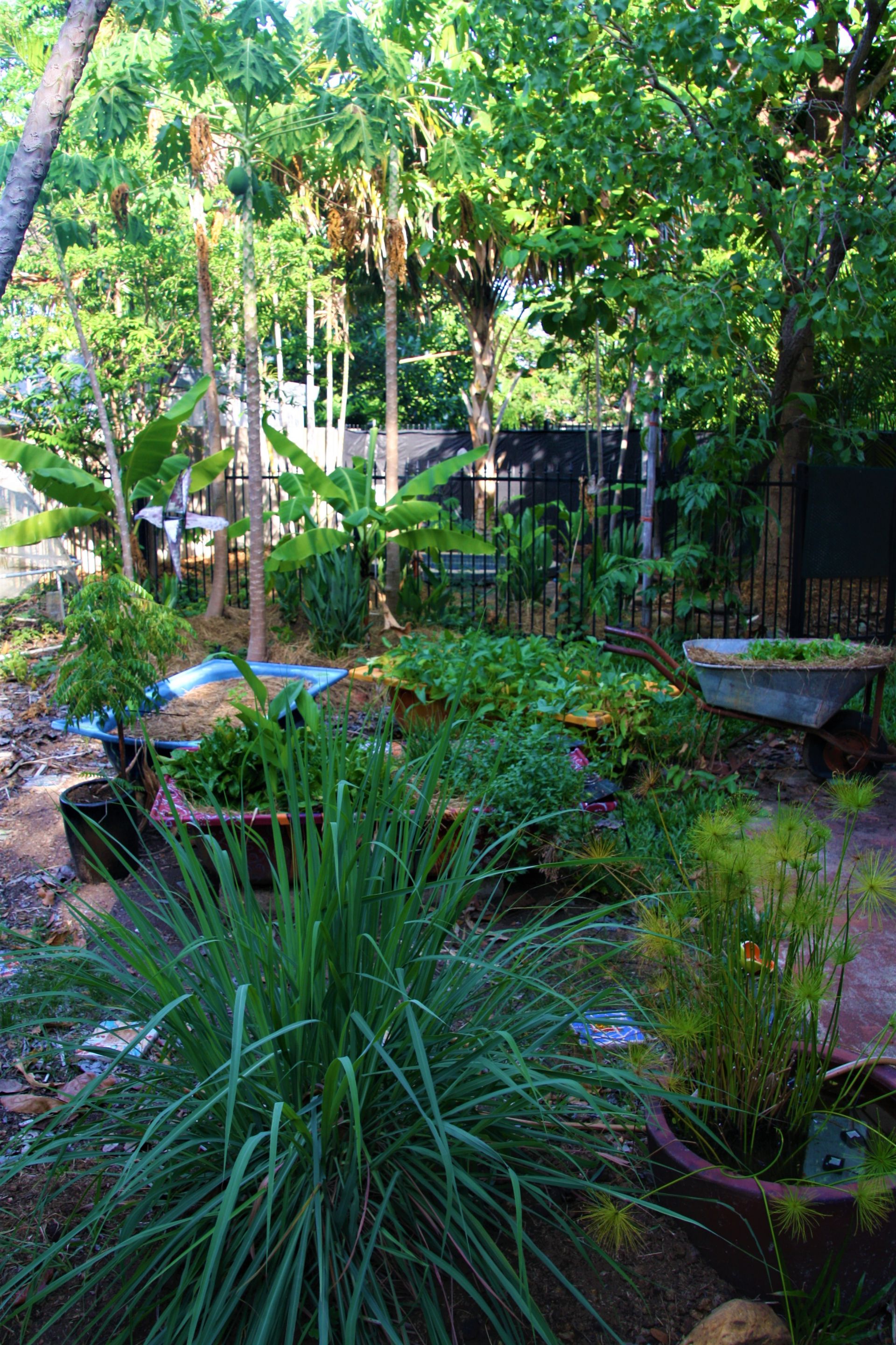Shady spacious garden featuring various fruit trees and natives