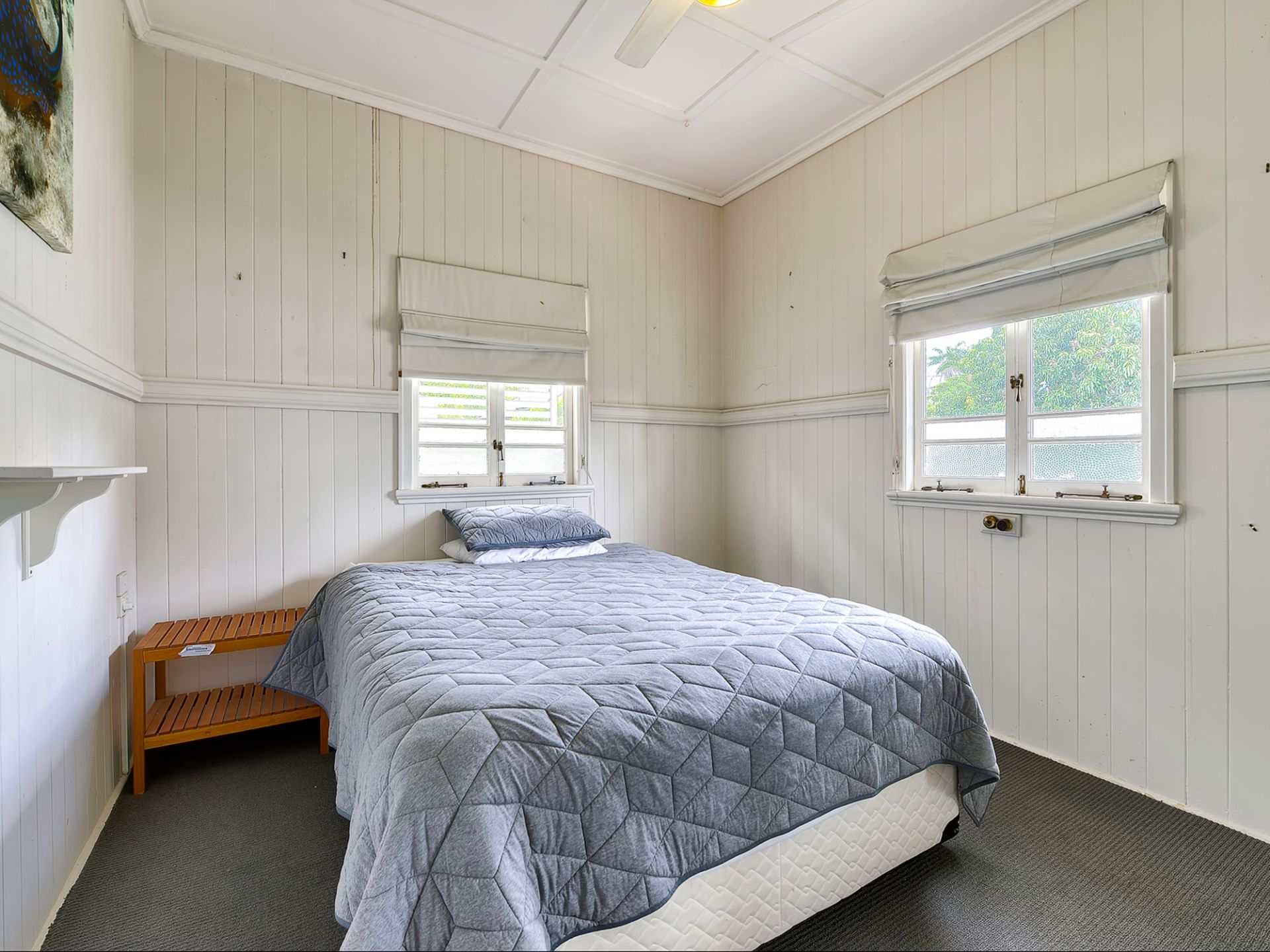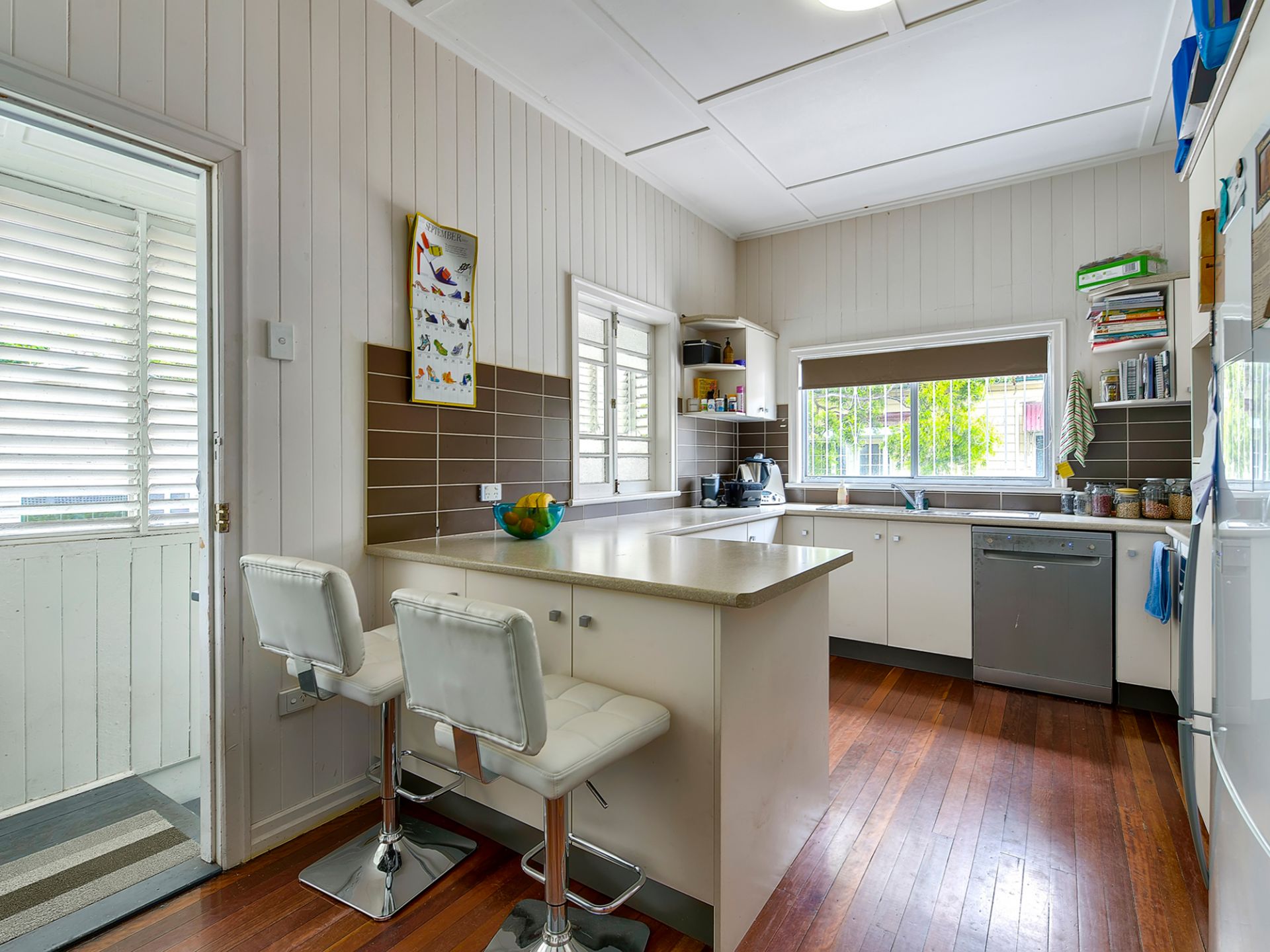 Accommodation consists of 3 bedrooms, 2 with built-in cupboards and the third is the traditional sleep-out which doubles as a sunroom, with 2 sets of French doors. This versatile separate sunroom has two way access and is a great extra space for the family, which has previously been utilised as a bedroom. The neat and tidy kitchen is spacious and easily services the dining, including gas cooking, dishwasher, and ample storage space. A modern bathroom has a shower over bath and a separate toilet.