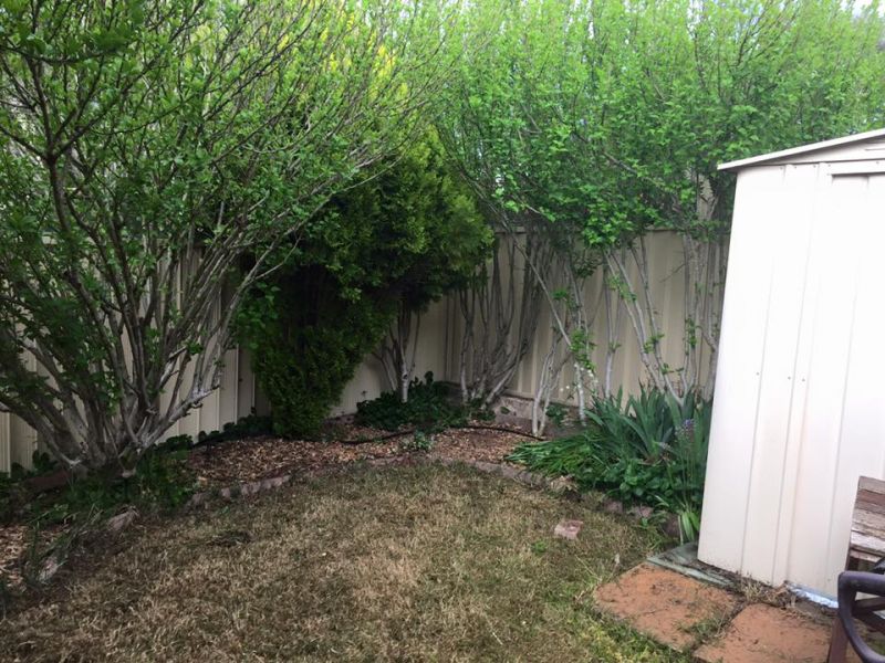 Landscaped garden with lovely hibiscus trees for shade with colourbond fence and garden shed