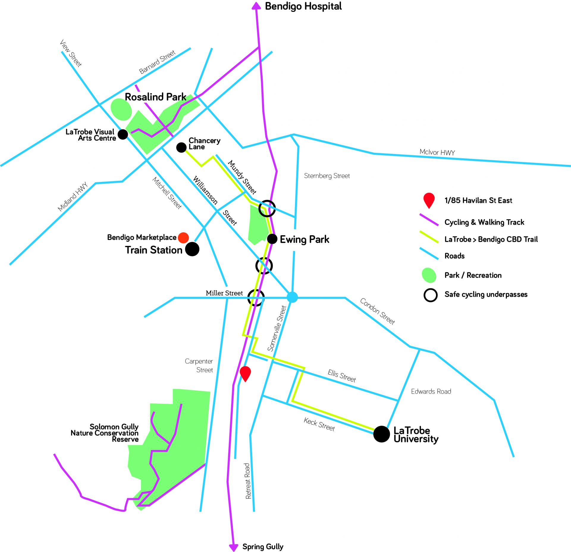 Situated along a picturesque creek, you can't go past this location. Located just over 2km to the Bendigo CBD, 1.4km to La Trobe University and 4km to the new Bendigo Hospital. All of which are accessible via a walking/ cycling track which runs directly outside the front door.