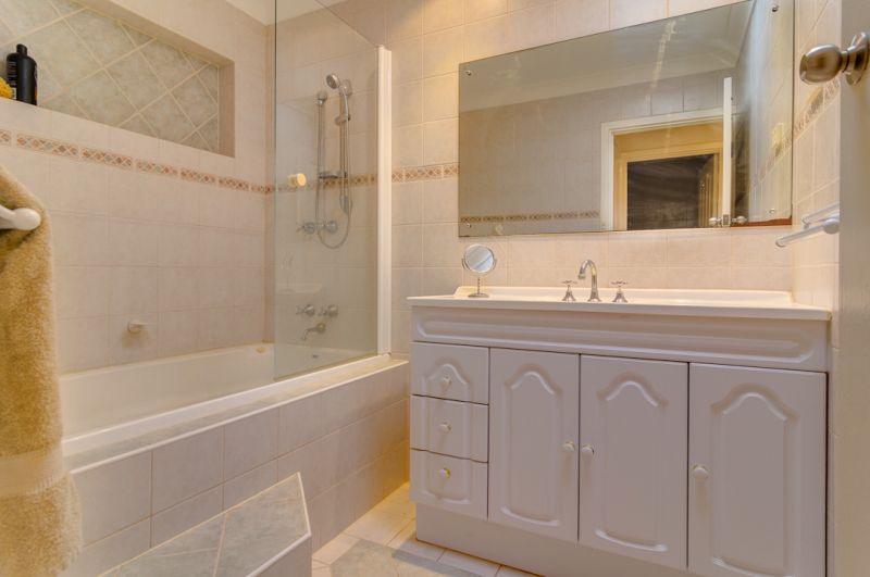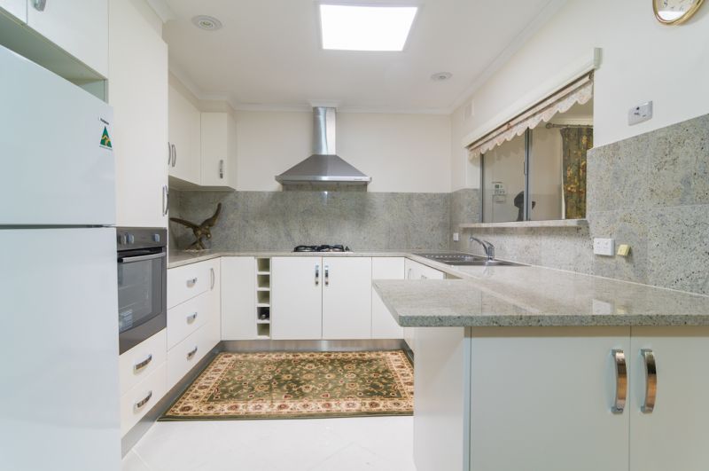 Tiled floors greet us on arrival and flow throughout the main home body, making a pleasing contrast with the neutral colour scheme. Quality down lighting, a ceiling fan and a split system air conditioner combine into a relaxing lounge area. The main kitchen / meals area is adjacent where a modern kitchen boasts stainless steel appliances, double sink, sky light and breakfast bar. A sliding glass door opens to a large family room that connects the main home body to the granny flat / extension.