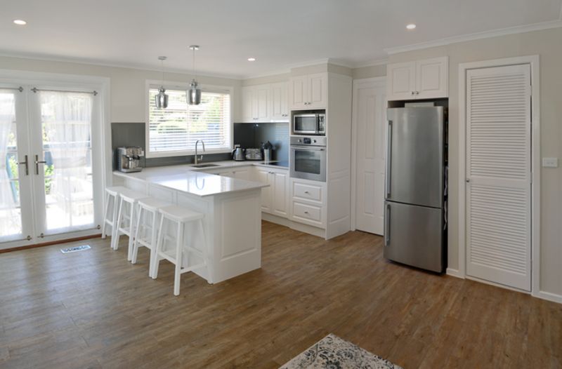 The front french door opens to the main entrance and looks towards an impeccably crafted kitchen which includes stone bench tops, soft close cabinetry throughout, stainless steel appliances, induction stove top, breakfast bar and louver pantry.