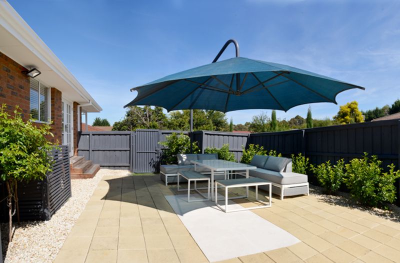 The courtyard consists of sandstone paving, growing privacy hedge and the large (5 meter in diameter) pivoting cantilever umbrella for shaded outdoor entertainment.