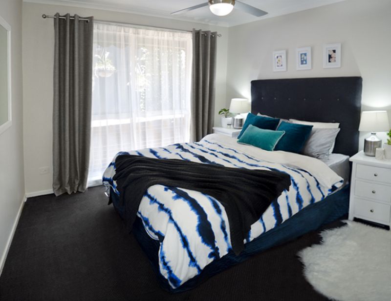 To the right of the kitchen is the dining space and walk through the hall way to find the master and spare bedrooms. Each fitted with sliding door built in robes and ceiling fans. The master bedroom includes a large window with view of the privacy screen and hanging pot plants.