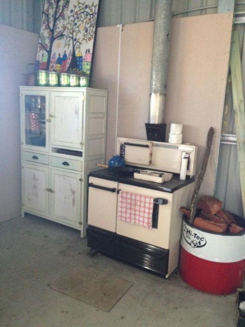 So many features including everhot wood stove connected to hot water tank for showers. Plus instant gas for showers when you dont have fire lit. Toilet under patio plumbed to septic system. The toilet and shower are custom made corrugated iron tanks and both have views to the dam. The toilet is a wonderful place to sit and enjoy the view as you ponder lifes great mysteries!!