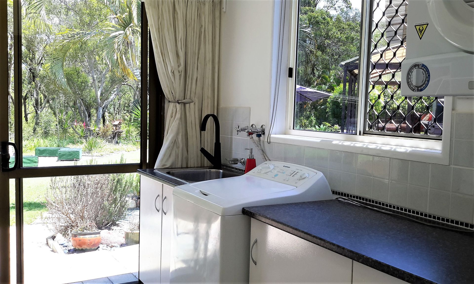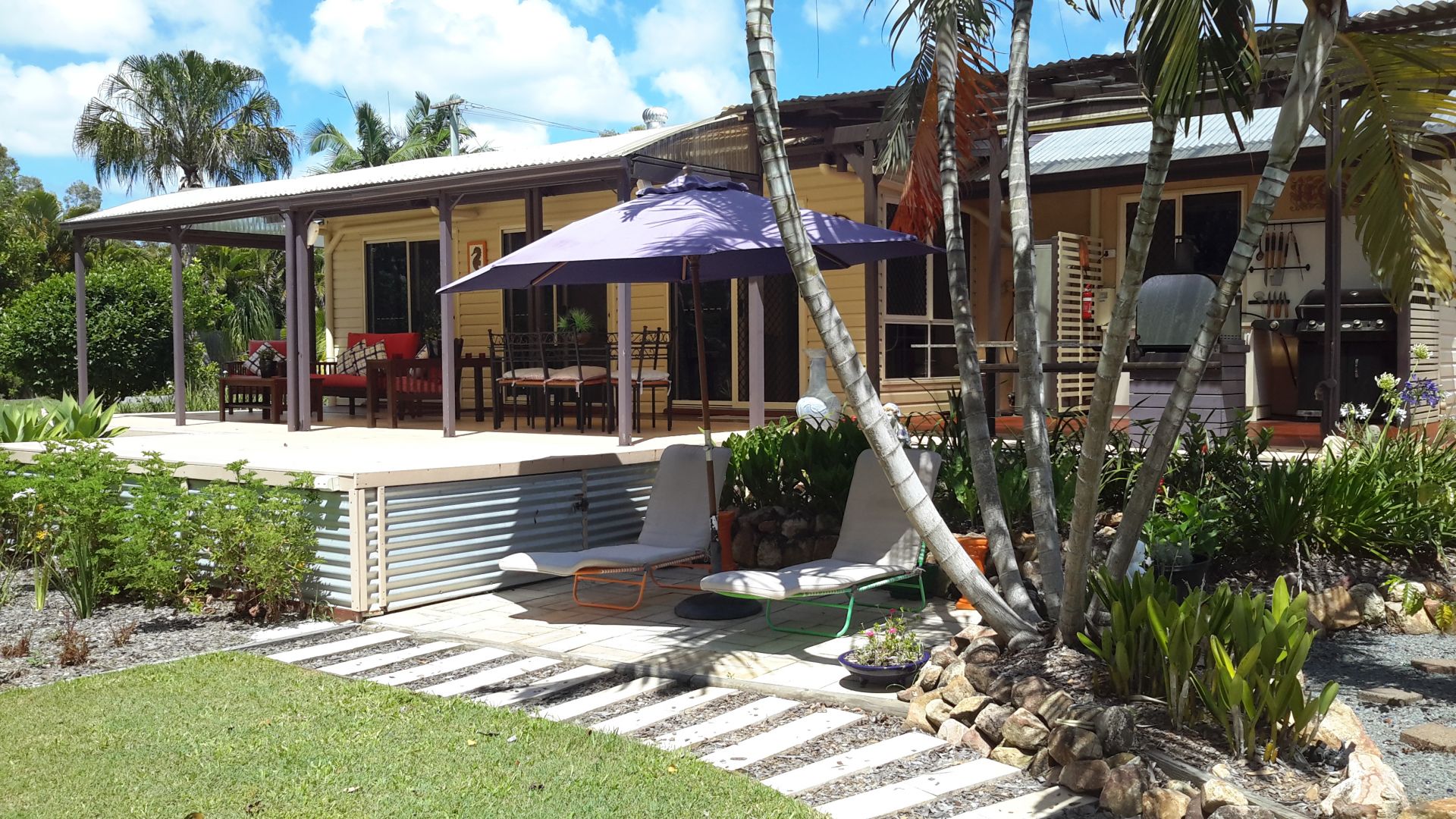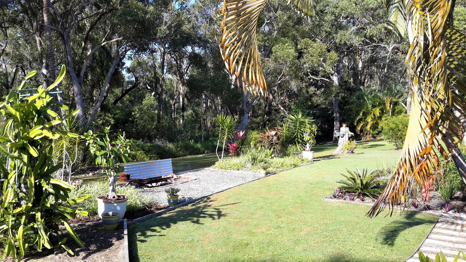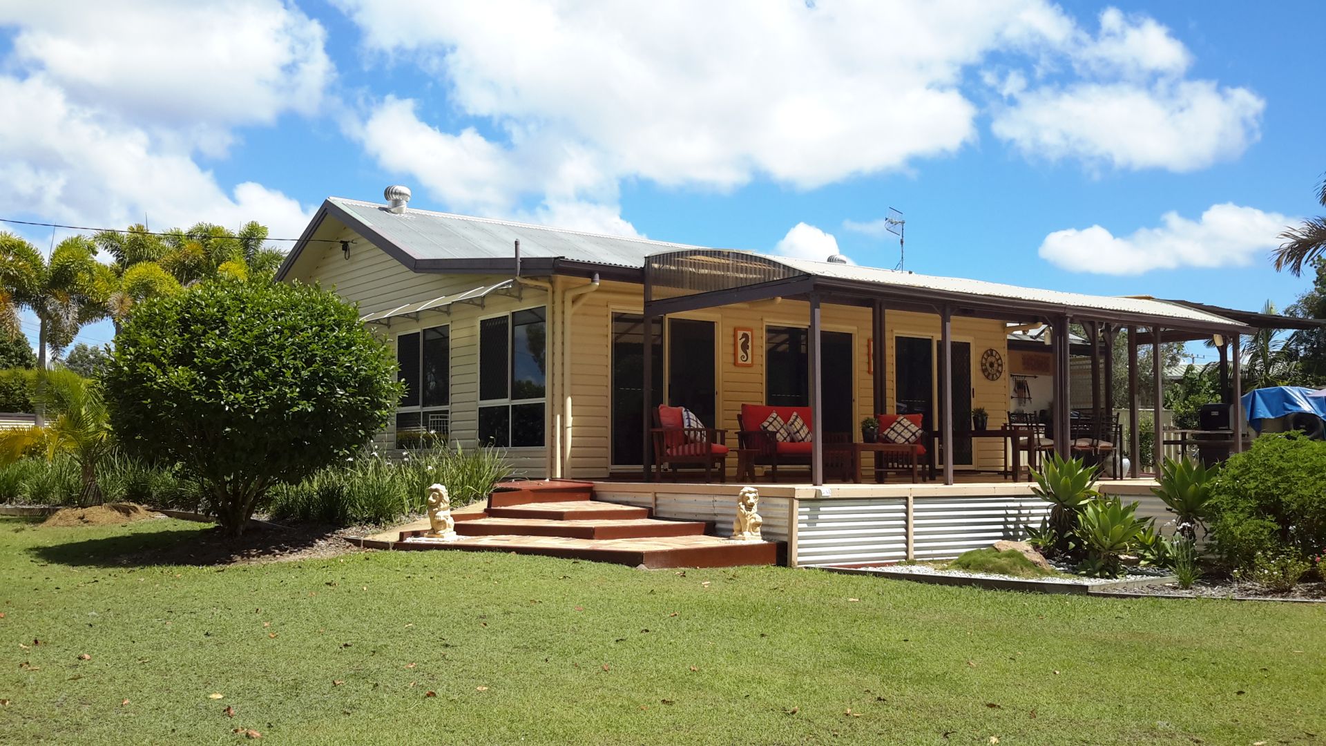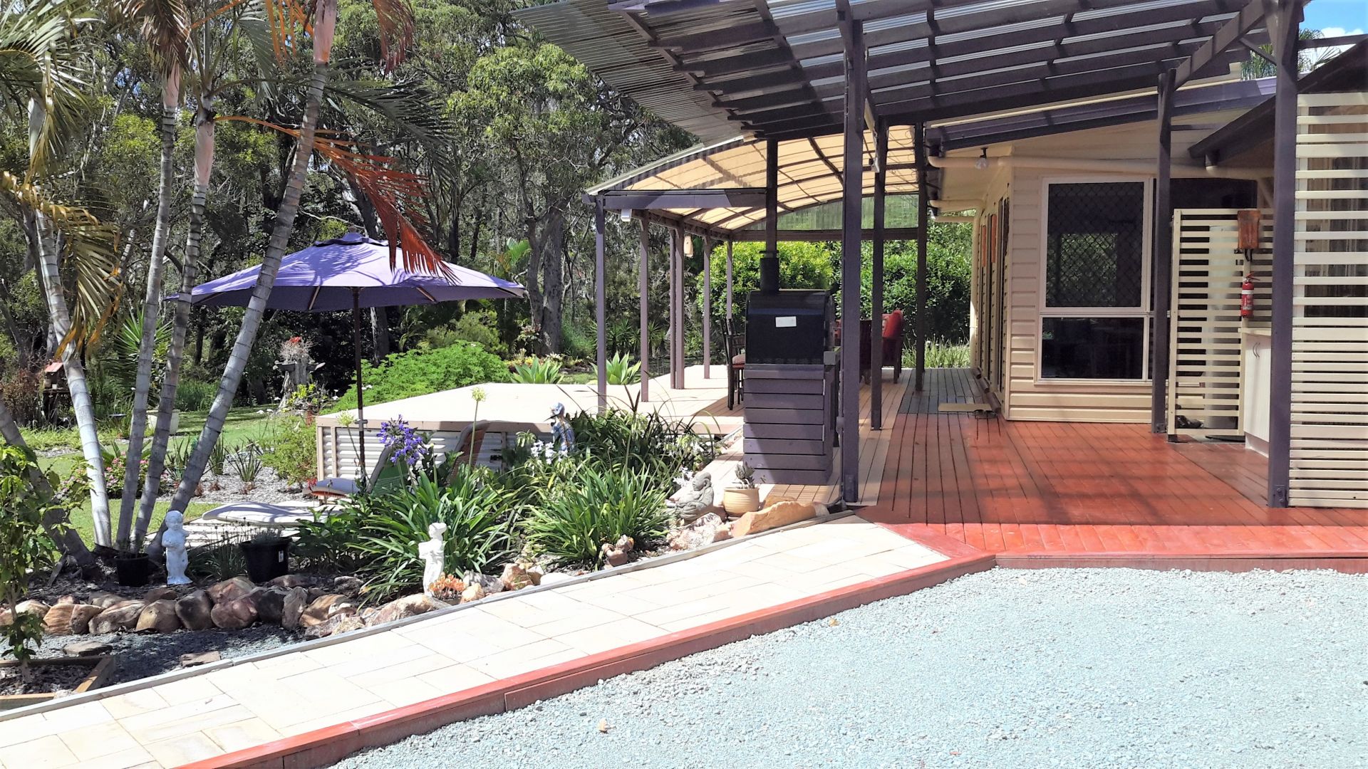 Gardens are well established with easy low maintenance planting and approx. 20 fruit trees including mango, lemon, dragon fruit, peach, macadamia, mulberry.