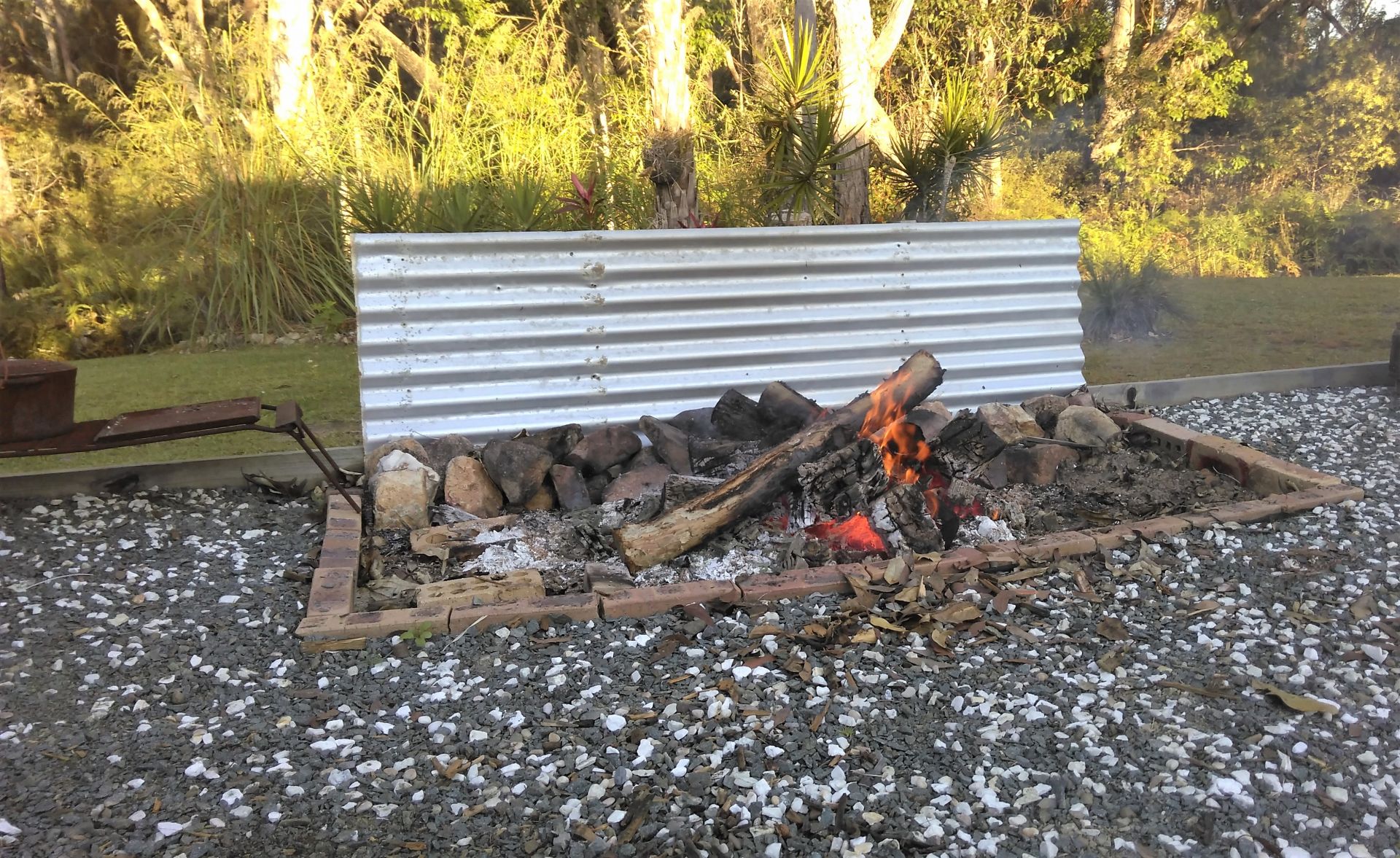 Large fire pit over looks bush.