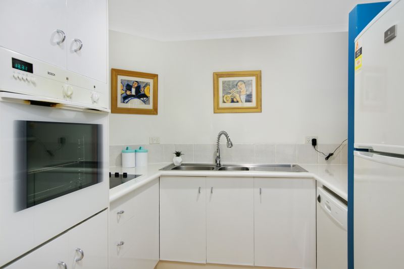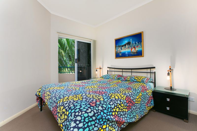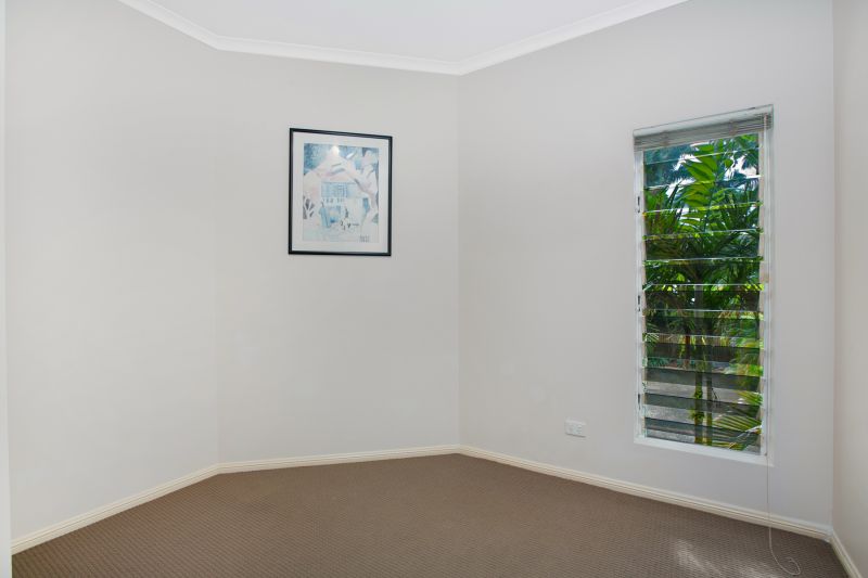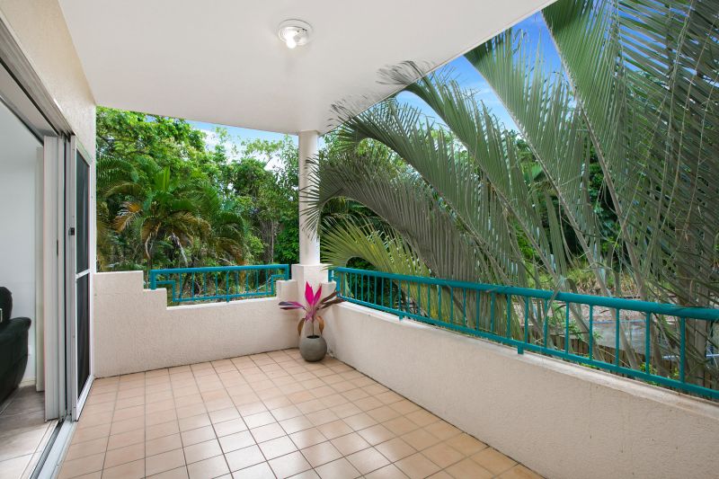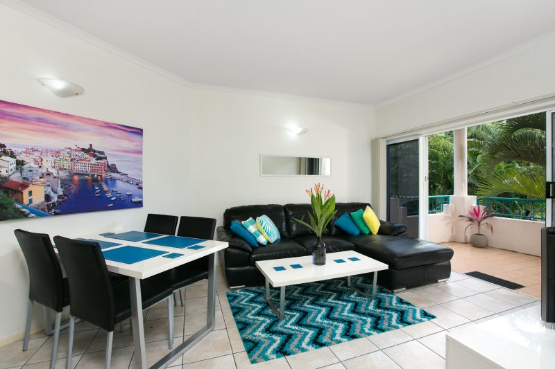 The tiled open plan living area adjoins the kitchen with dishwasher, electric cooktop, wall oven tower, and overhead cupboards. All quality carpeted bedrooms have built-in robes with the main bedroom having a queen bed with an ensuite and direct access to the spacious tiled balcony with leafy, tropical outlook. The second bedroom has 2 single beds and also has its own tiled balcony and the third bedroom has a single bed but could well be utilised as an office or study.