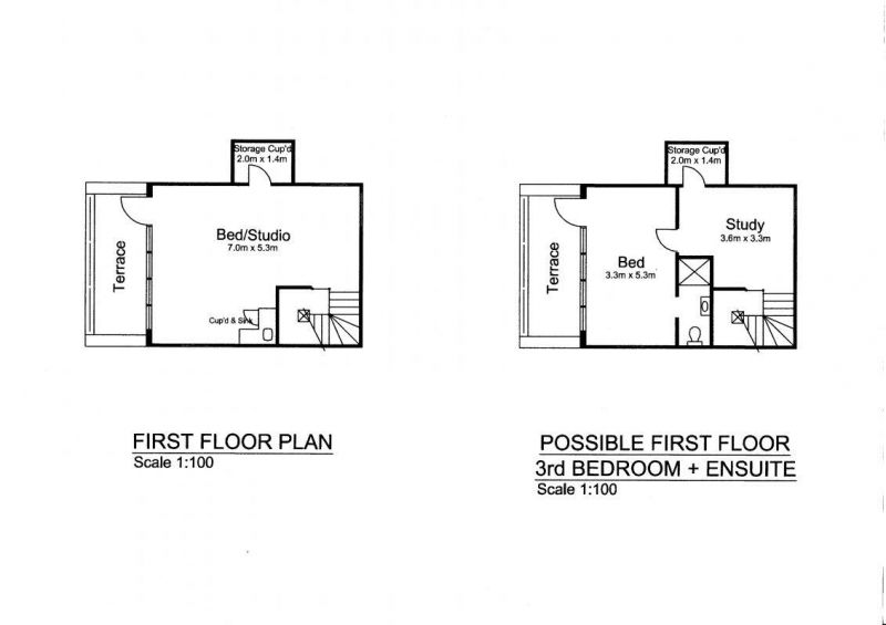 The second bedroom is alongside the main bathroom with a large bath set into a tiled upstand.The upper floor currently is used both as a bedroom when required and as a Studio which has access to a roof terrace, ideal for watching the sunset and bird life, whilst having a few drinks . The top floor is of sufficient dimensions that it can easily be subdivided to form a formal bedroom with ensuite and separate Study/Studio. The plumbing for a future en-suite is substantially in place.