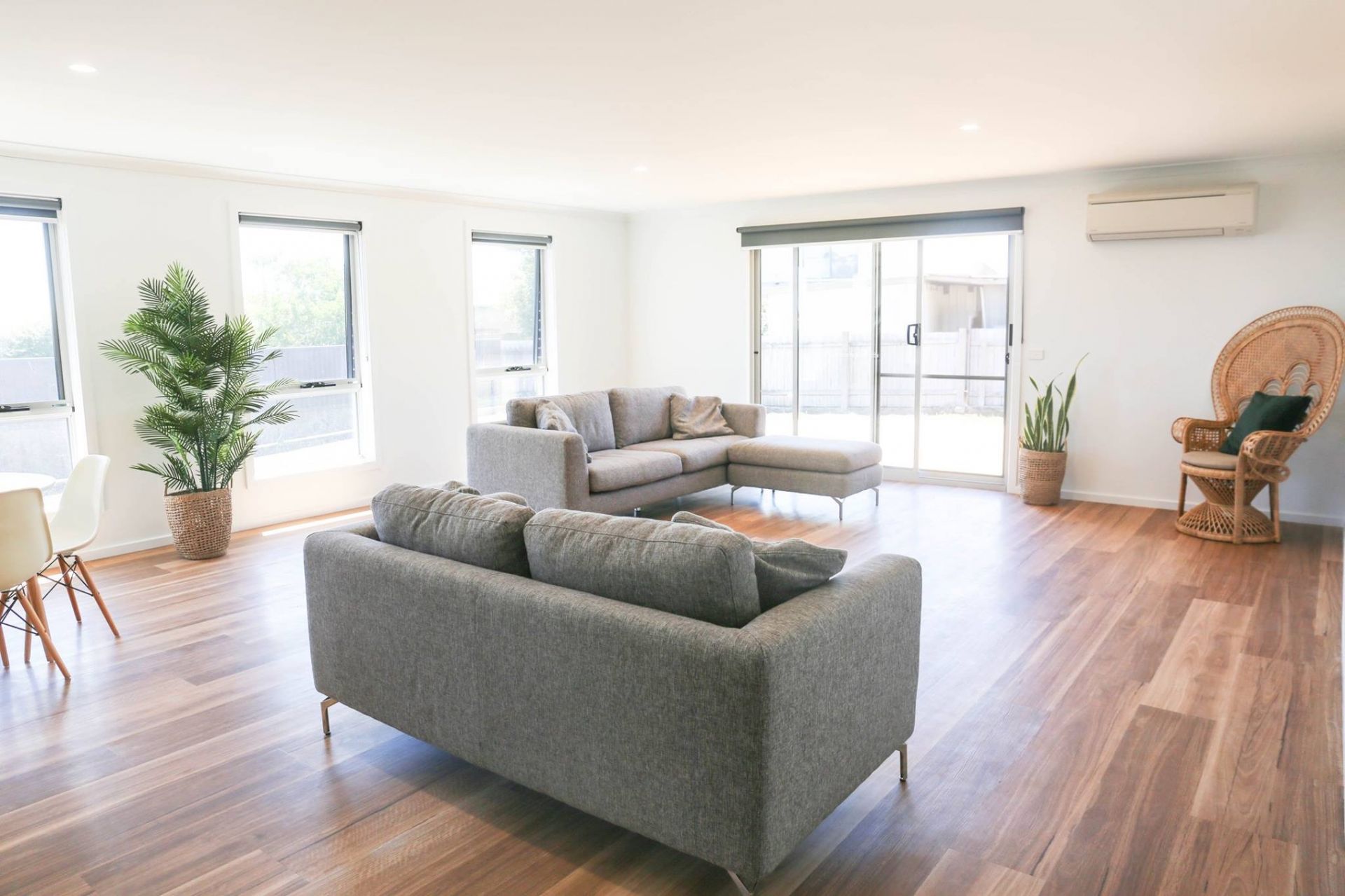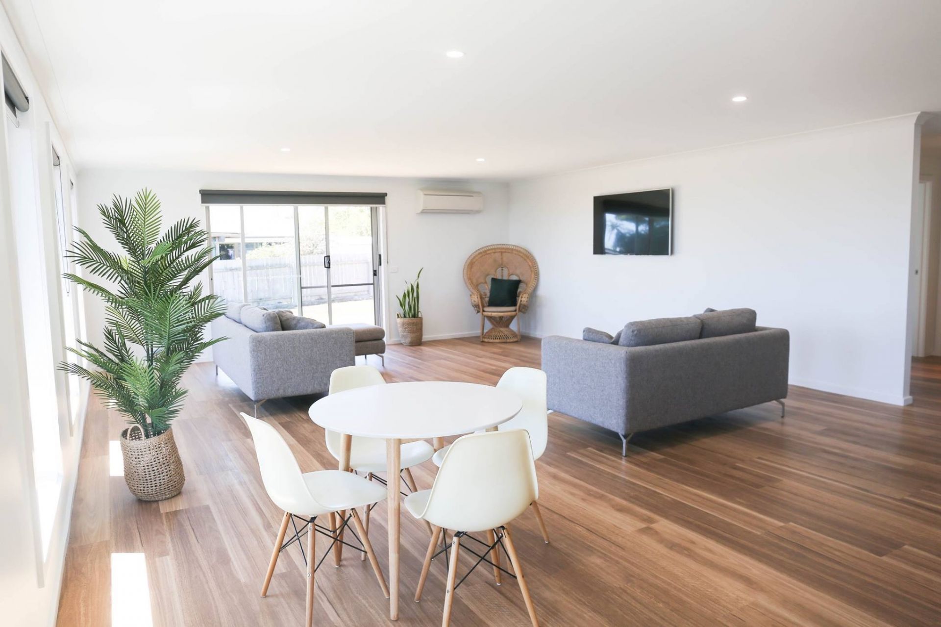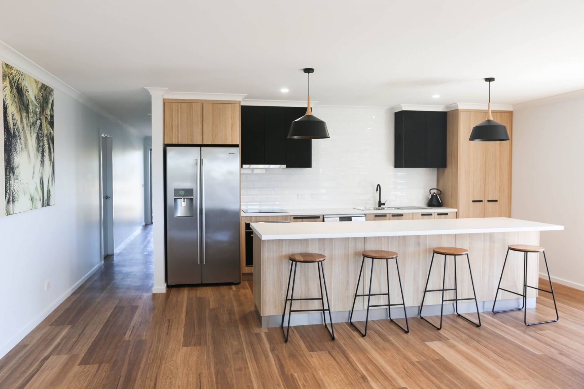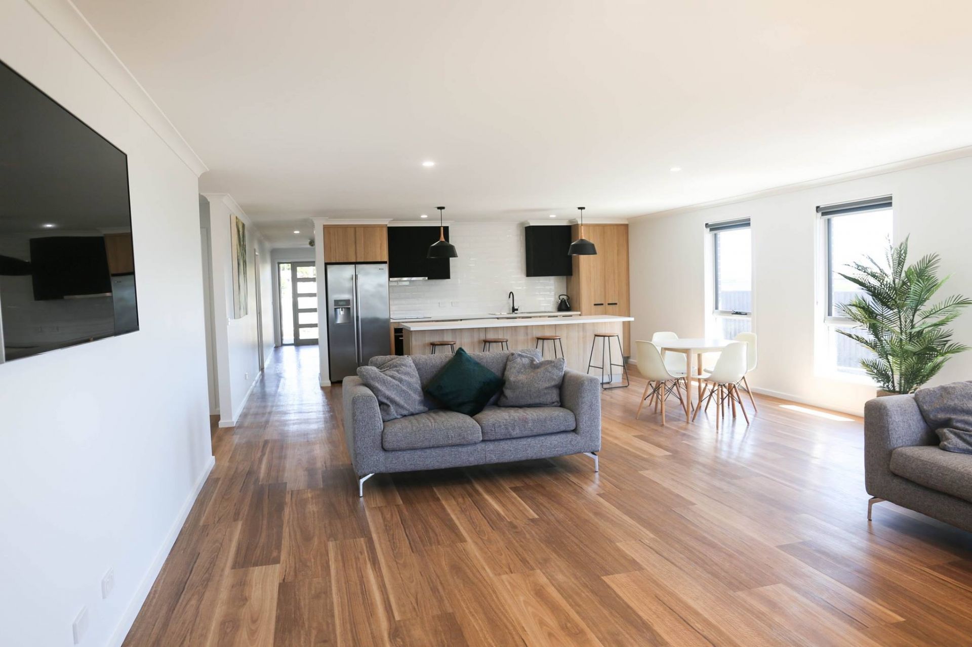 Open plan living, modern kitchen with spacious bench, overlooking the living area and onto the deck and backyard.