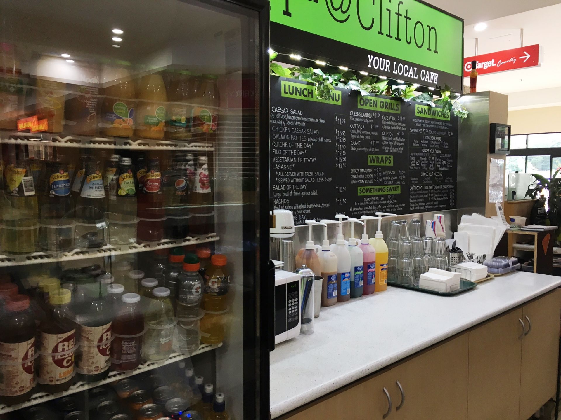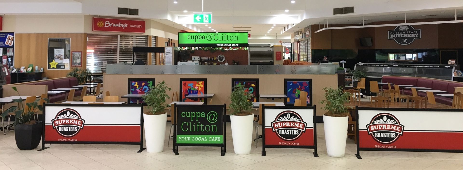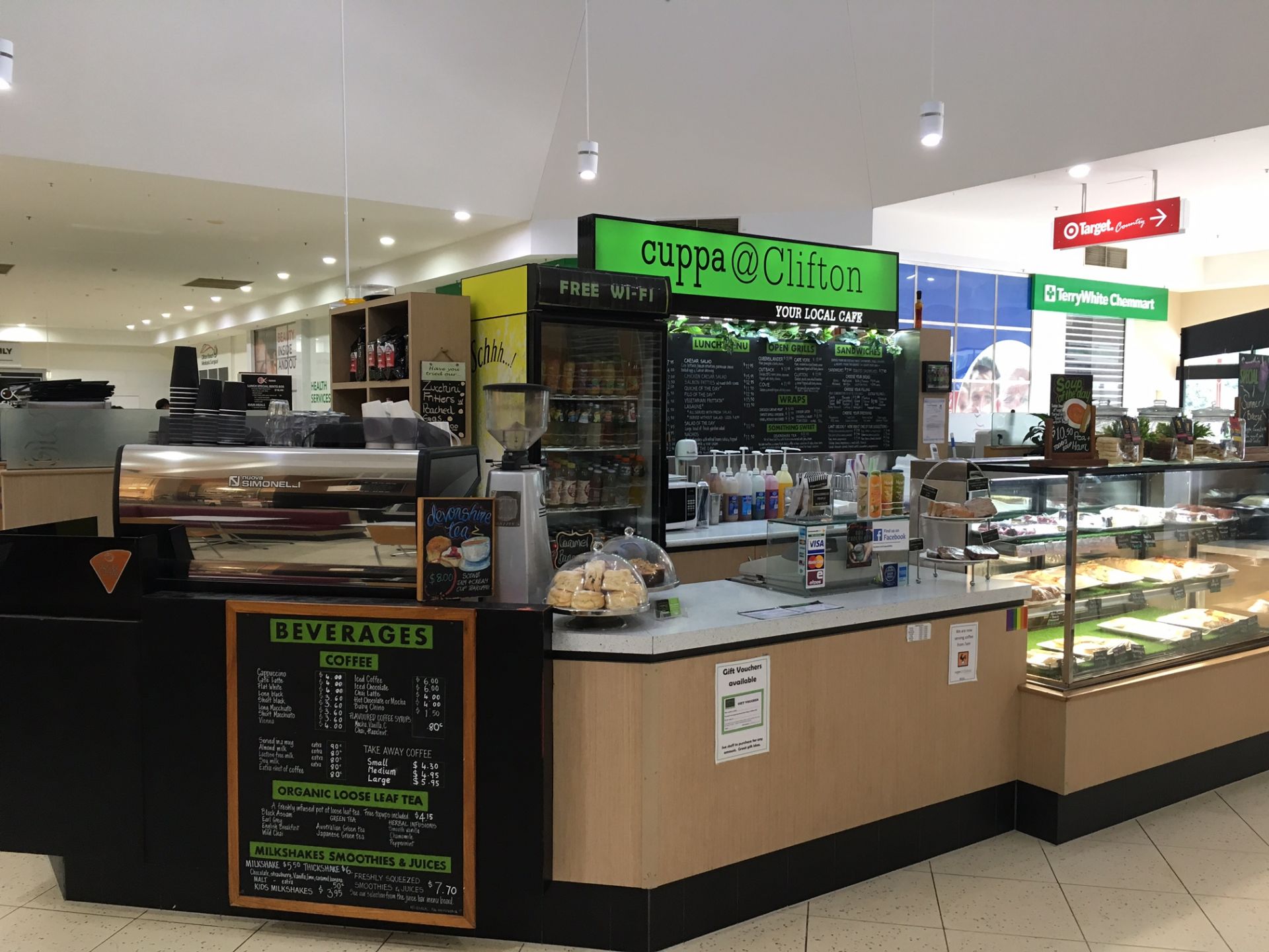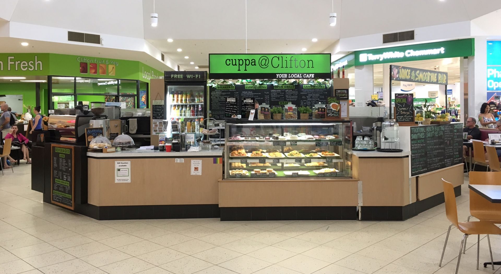 Cuppa @ Clifton Café is an open kiosk situated right in the middle of all entry and exit points within the shopping centre giving maximum visibility. All visitors or potential customers have to walk around or past Cuppa @ Clifton Café in order to shop at Coles. This prime position has the café located right in-between the main entry doors and Coles supermarket. The café is known as the ‘hub’ of the shopping centre and the ‘go-to’ meeting point.