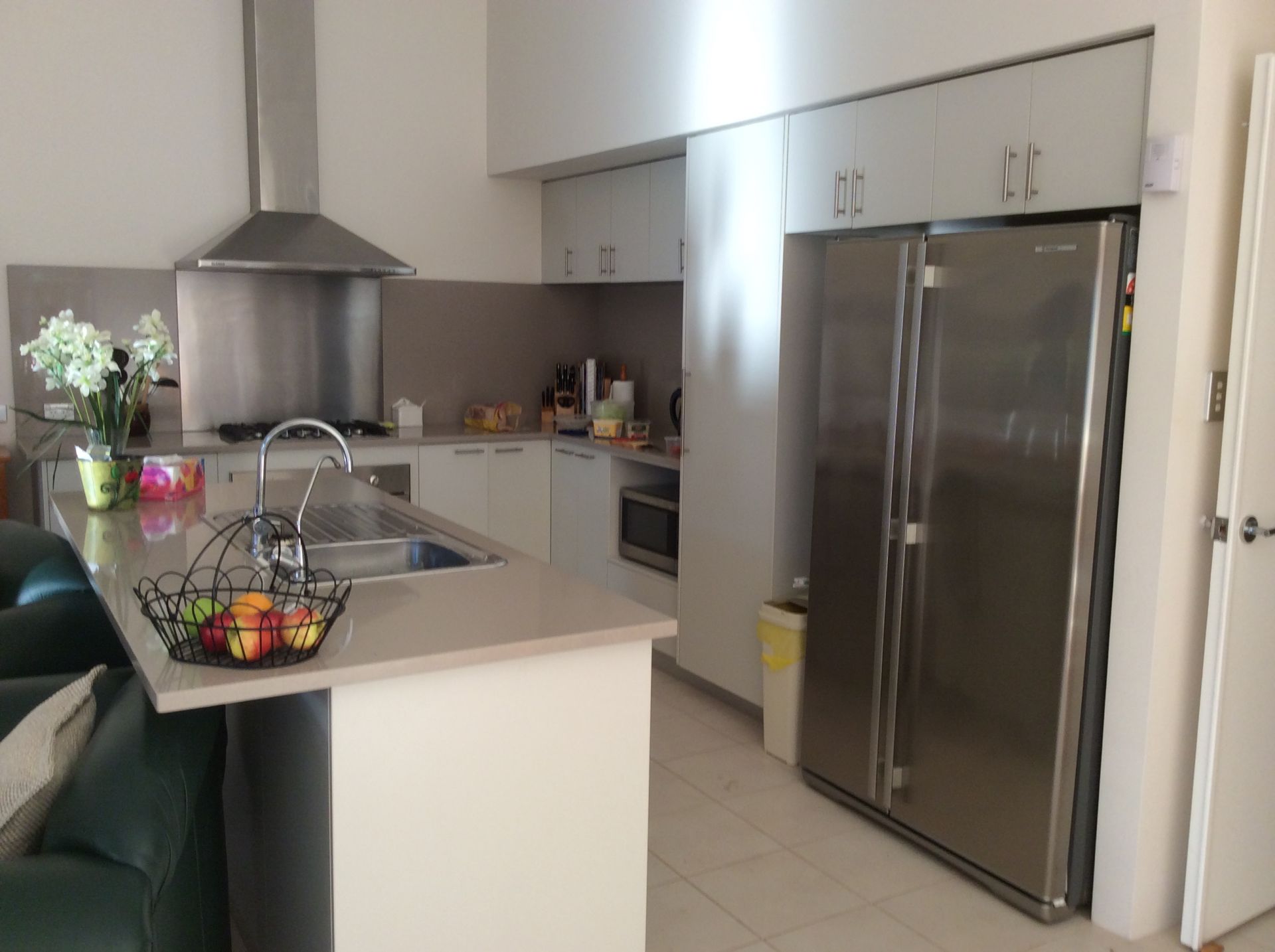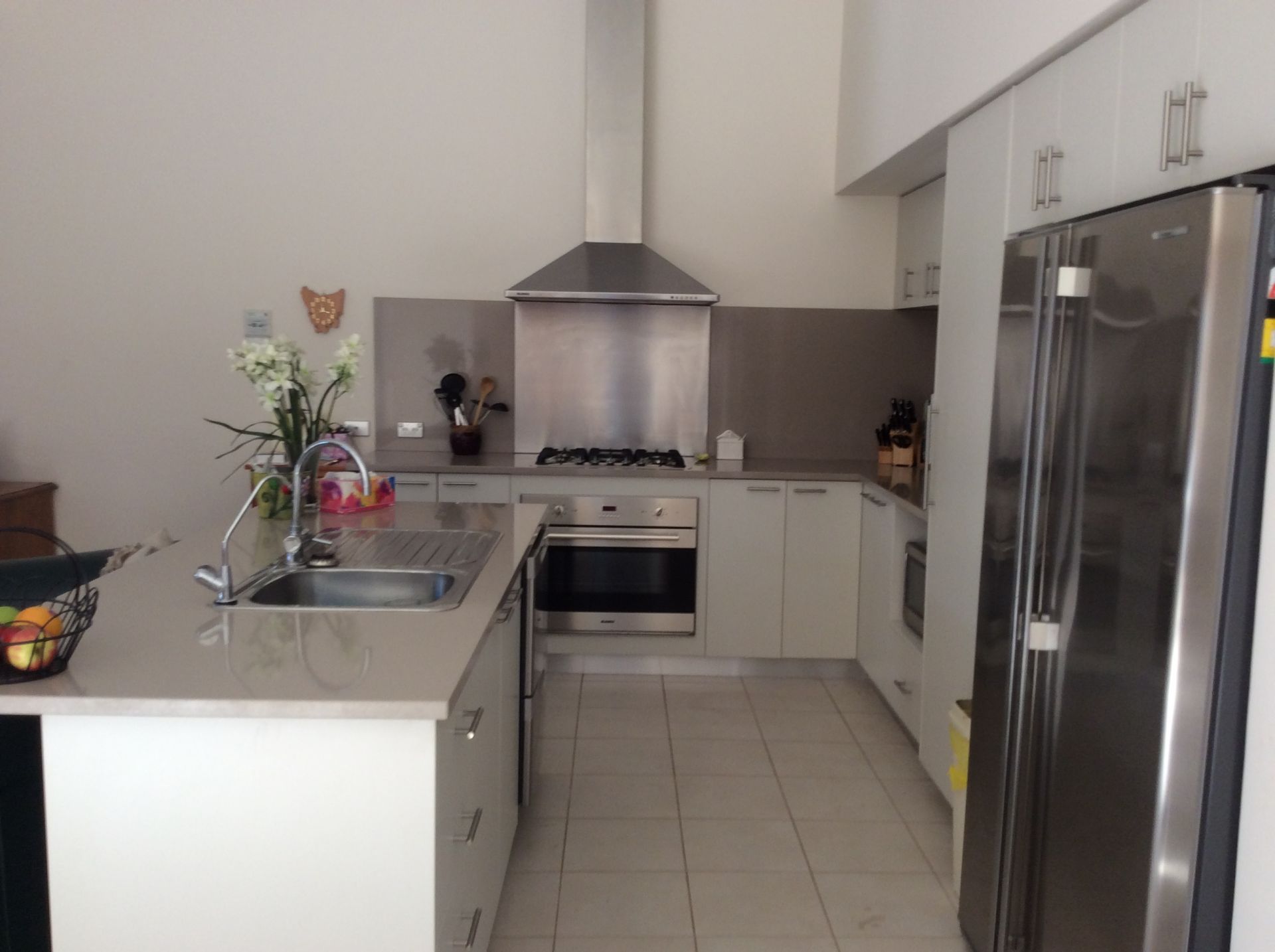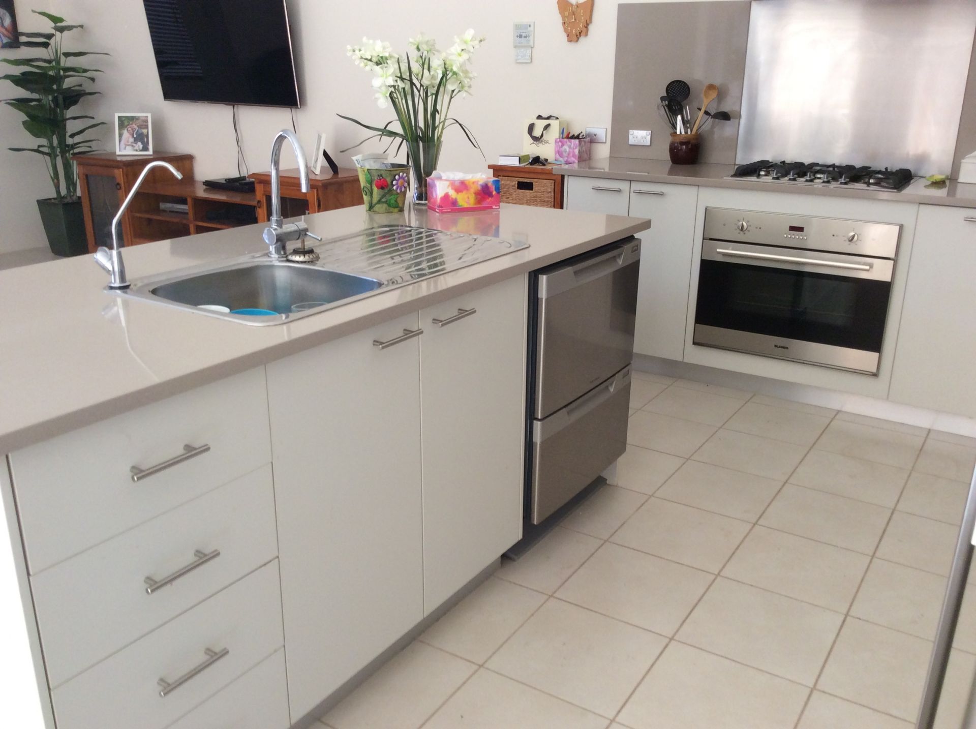 The kitchen area, with all the cupboard space you will ever need, is complete with a stone bench tops, stainless steel double draw dishwasher. Recess for a double door fridge, Bianco electric oven, gas hotplates and a stainless steel rangehood,