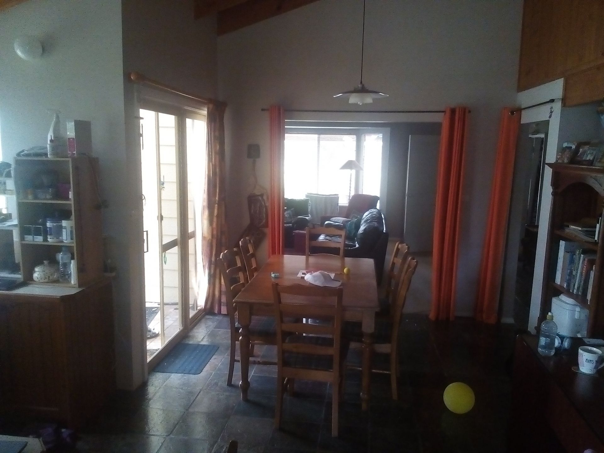 Spacious kitchen/dining with wood paneling, high exposed beams under a pitched ceiling, slate flooring and a central island breakfast bar. Lots of light.
