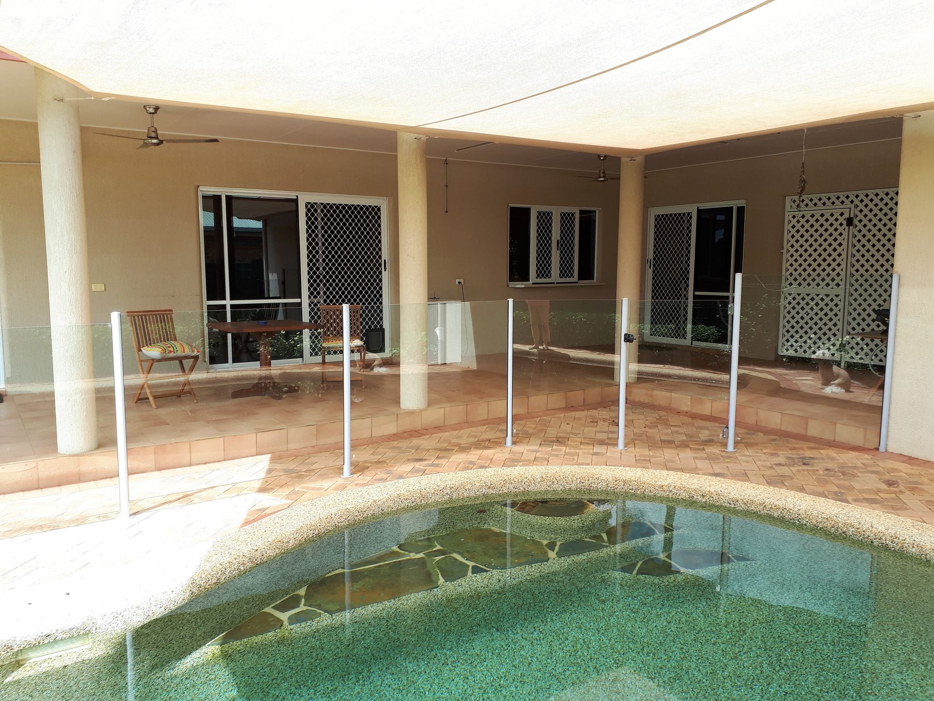 * Inground saltwater pool under shade sail