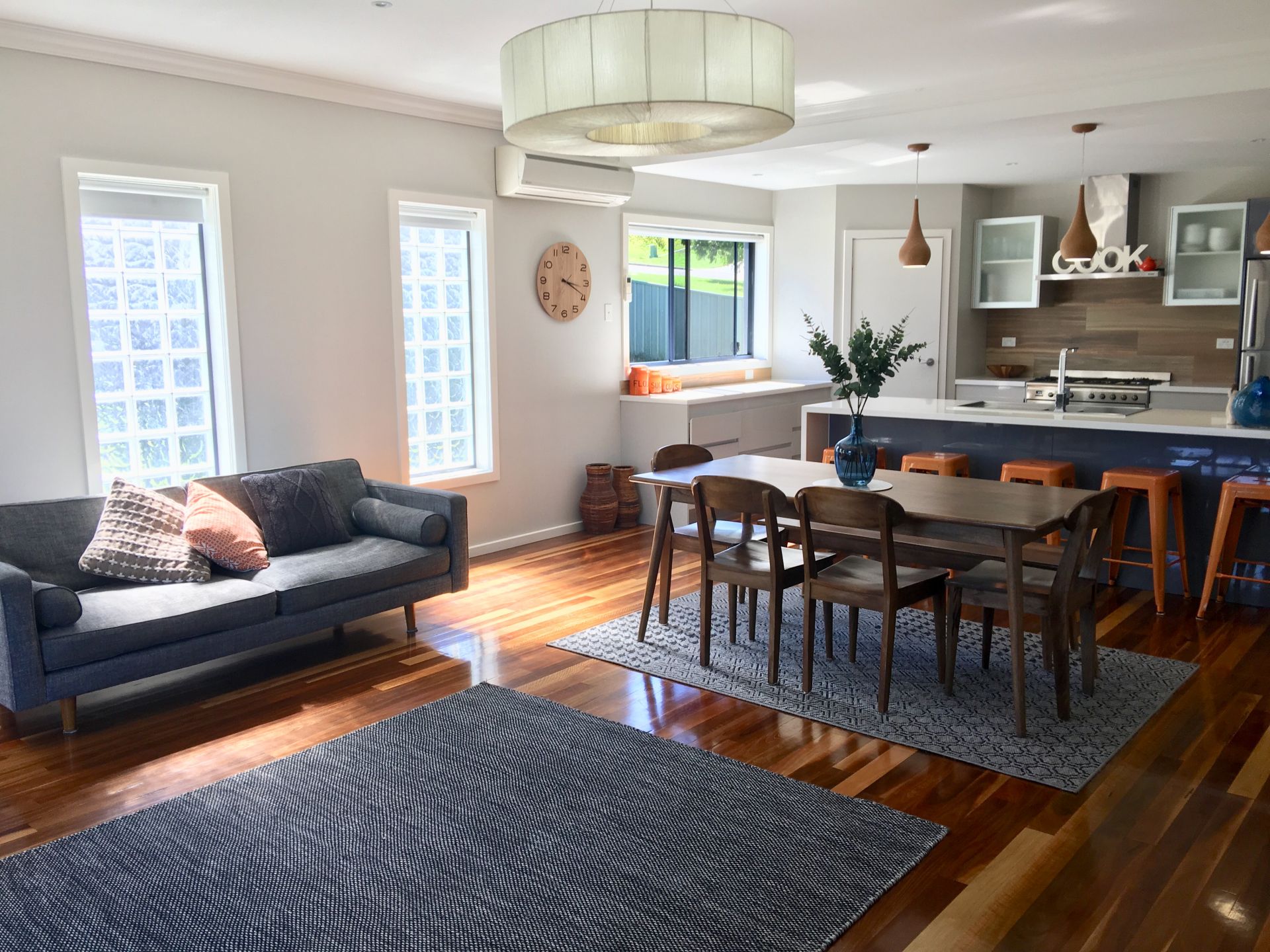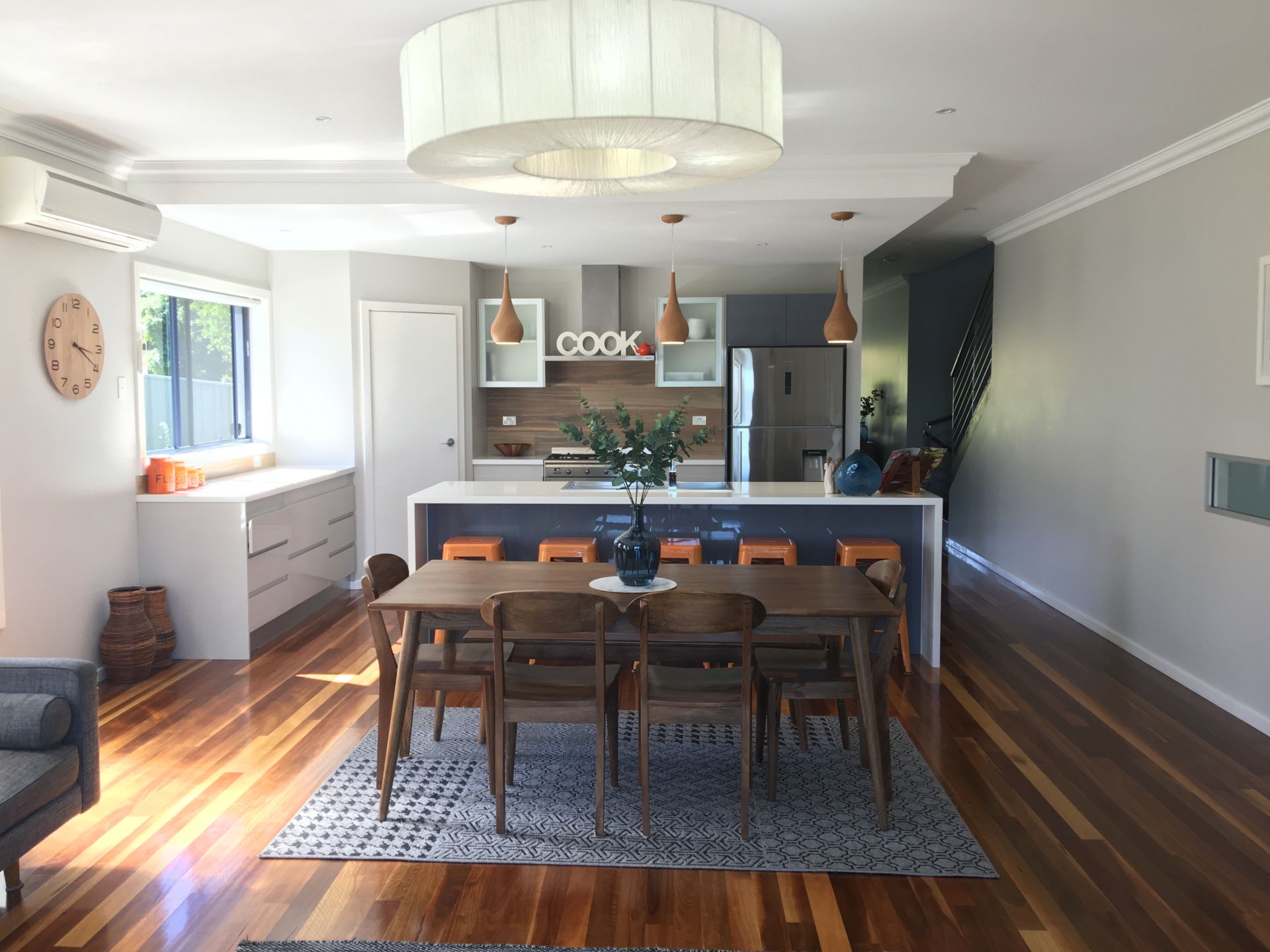 Head up to a generous lounge room and you're sure to notice the big round retro light shade, giving your room that "funky" feel, while providing ample space for the family and more. About turn, and you walk past a powder room that leads into a spacious kitchen, with stone waterfall edges, smeg appliances, 900mm freestanding gas cooktop and oven. Do not overlook the walk-in pantry. Loads of storage.