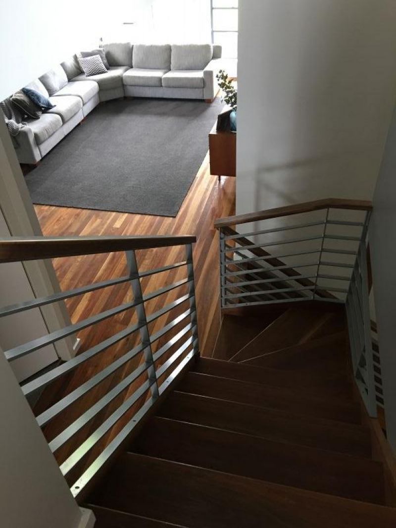 The kitchen and dining flow onto another informal living area, which also opens out onto its own deck. This living room deck and the rumpus room deck have a set of stairs outside that join the two levels together making it possible to walk up and down the stairs inside and outside the house.