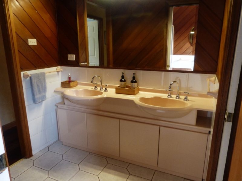The two year young laundry is a dream with a stunning 5 cm thick sealed red gum slab, a designer sink, under bench washing machine and soft close cabinetry. Opposite the benchtop is a floor to ceiling wall of custom fitted cupboards to accommodate linen, small appliances and large cleaning equipment. There is even a custom tap fitting under the sink that can provide warm water to the outside tap for washing cars, boats and animals (including dogs and horses) in winter. the window above the bench has a fitted, lockable cat door that leads to an secure outside cat run.