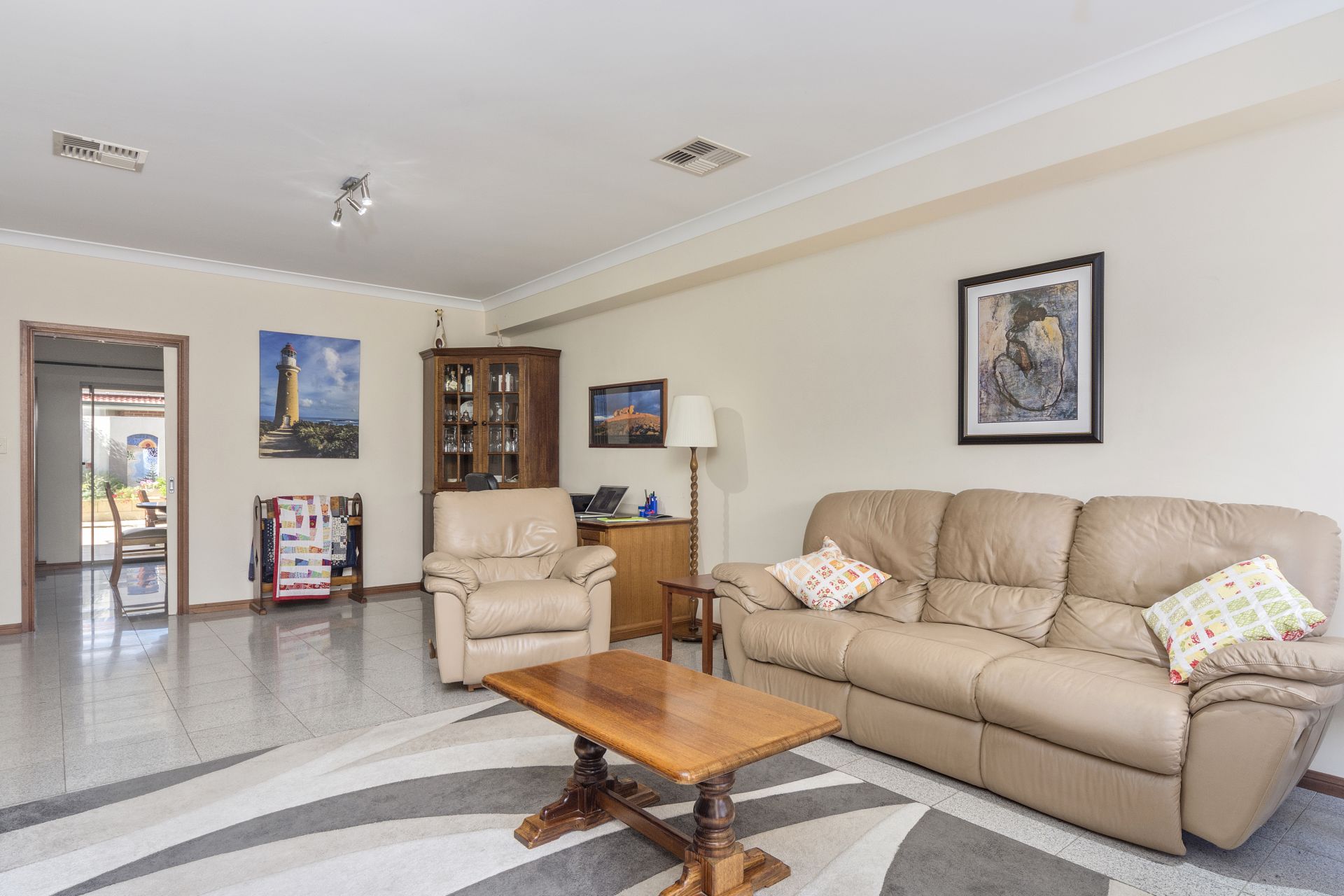 Upon entering the home you will find a spacious lounge area big enough for a lounge area and home office. The kitchen has plenty of storage and the dining area is large.Kitchen is modern and easy to use with gas cooktop and dishwasher. Off of the kitchen is the laundry and large toilet with full vanity unit.