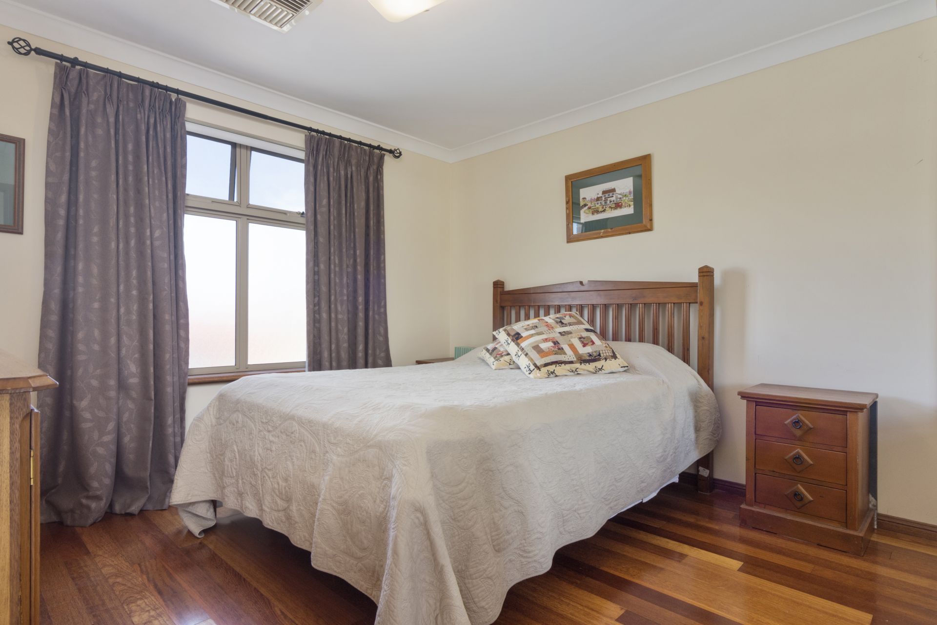 Upstairs are 3 extra large bedrooms each with built in robes. The main has a large shuttered window overlooking Rotary Park to the beach and ocean.