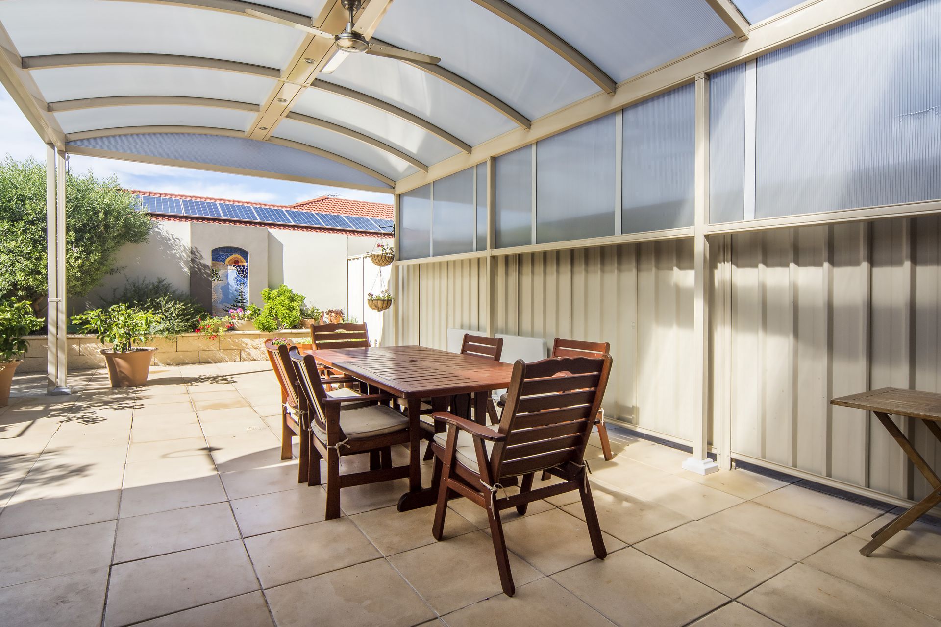 Exiting the back door you find yourself under the extensive open pergola (9mX5m) with down lights and fan. A beautiful fountain wall mosaic on the back fence sets off the yard and the native plants finish it off nicely.