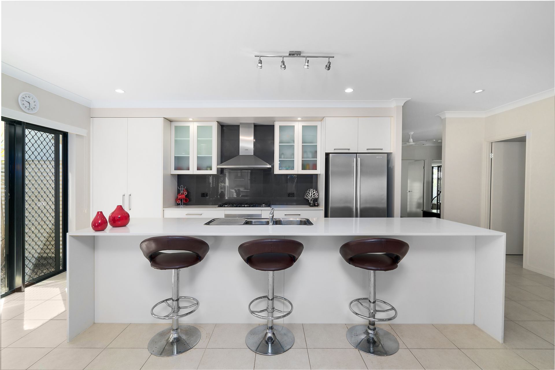 The stylish considerations continue outside, showcasing an irrigated landscaped tropical garden with an alfresco area next to the solar heated plunge pool. The alfresco area comes complete with bbq, range-hood, bar fridge, fans and is wired for an outdoor TV. This lovely home has reverse cycle split air-conditioning and ceiling fans in all rooms, remote controlled double garage with the space to fit another 2 cars in the driveway and a 5.5kw solar panel system.
