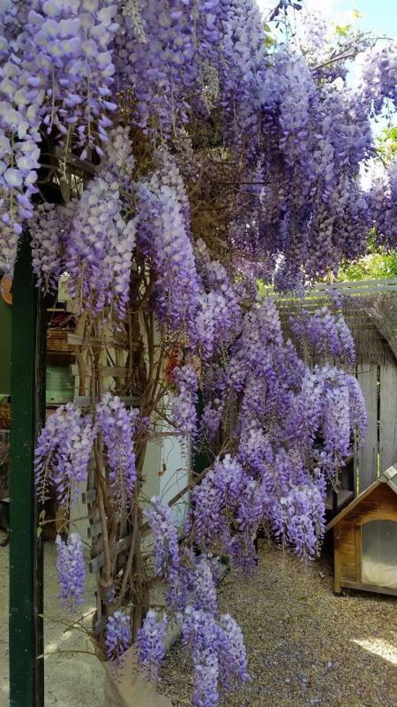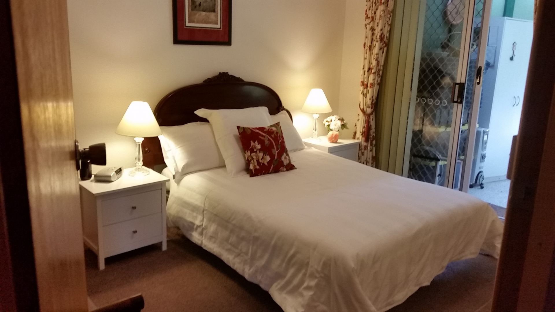 French sliding doors (with dog/cat flap) lead out onto the covered entertainment area which is shaded by a magnificent wisteria creeper and surrounded by lush lawns, shrubs and trees.
