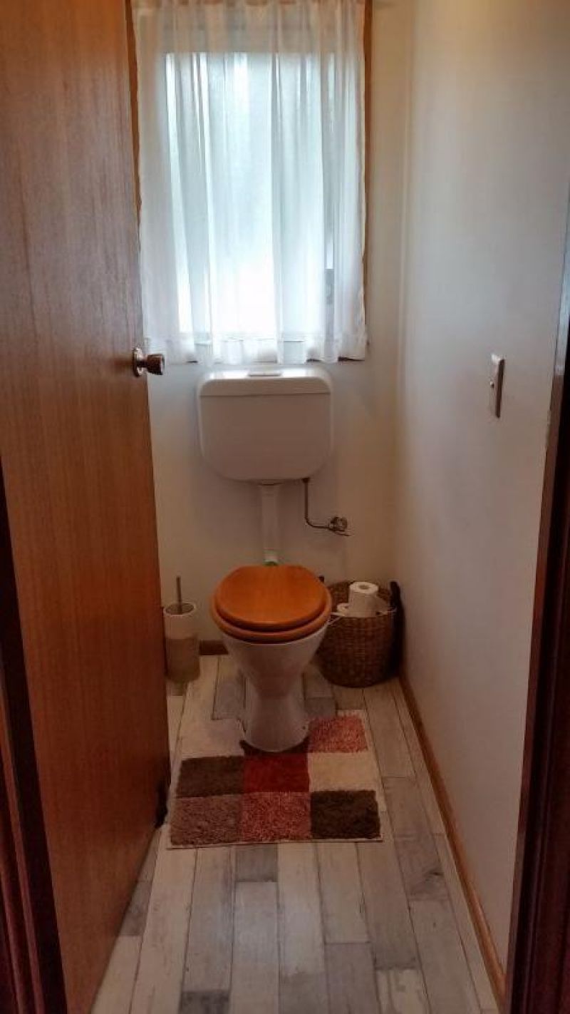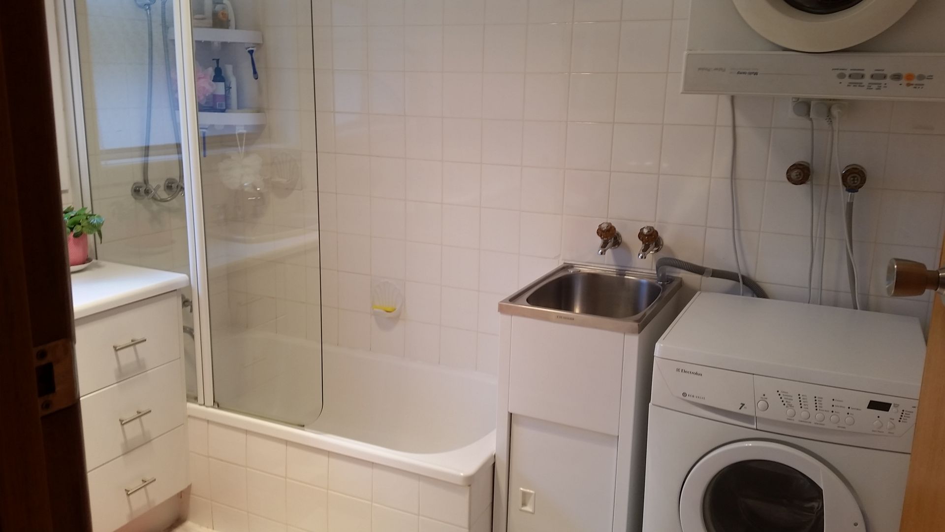 The large bathroom has a shower over the bath, an extra large bespoke vanity with the laundry space included and a separate toilet and linen/broom cupboard.