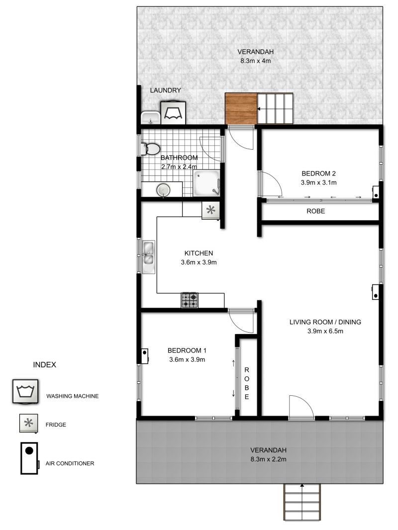 The generously sized bedrooms feature large ceiling to floor built in robes with sliding mirrored doors, air-conditioning and breeze capturing louvre windows plus there is a spacious bathroom with large shower.