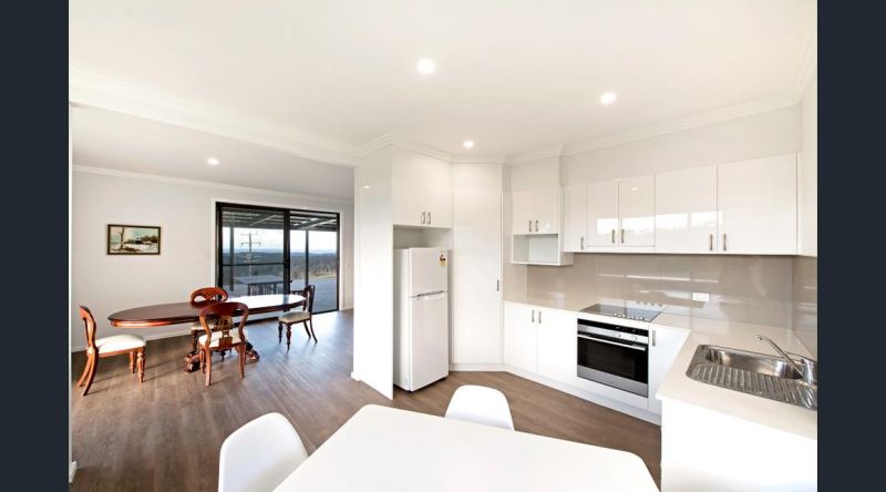 The single level wrap around open fire warmed L shape open plan living area flows seamlessly onto the huge panoramic mood lit entertainment and relaxation deck half covered for shade and all weather use and into the modern eat in kitchen.