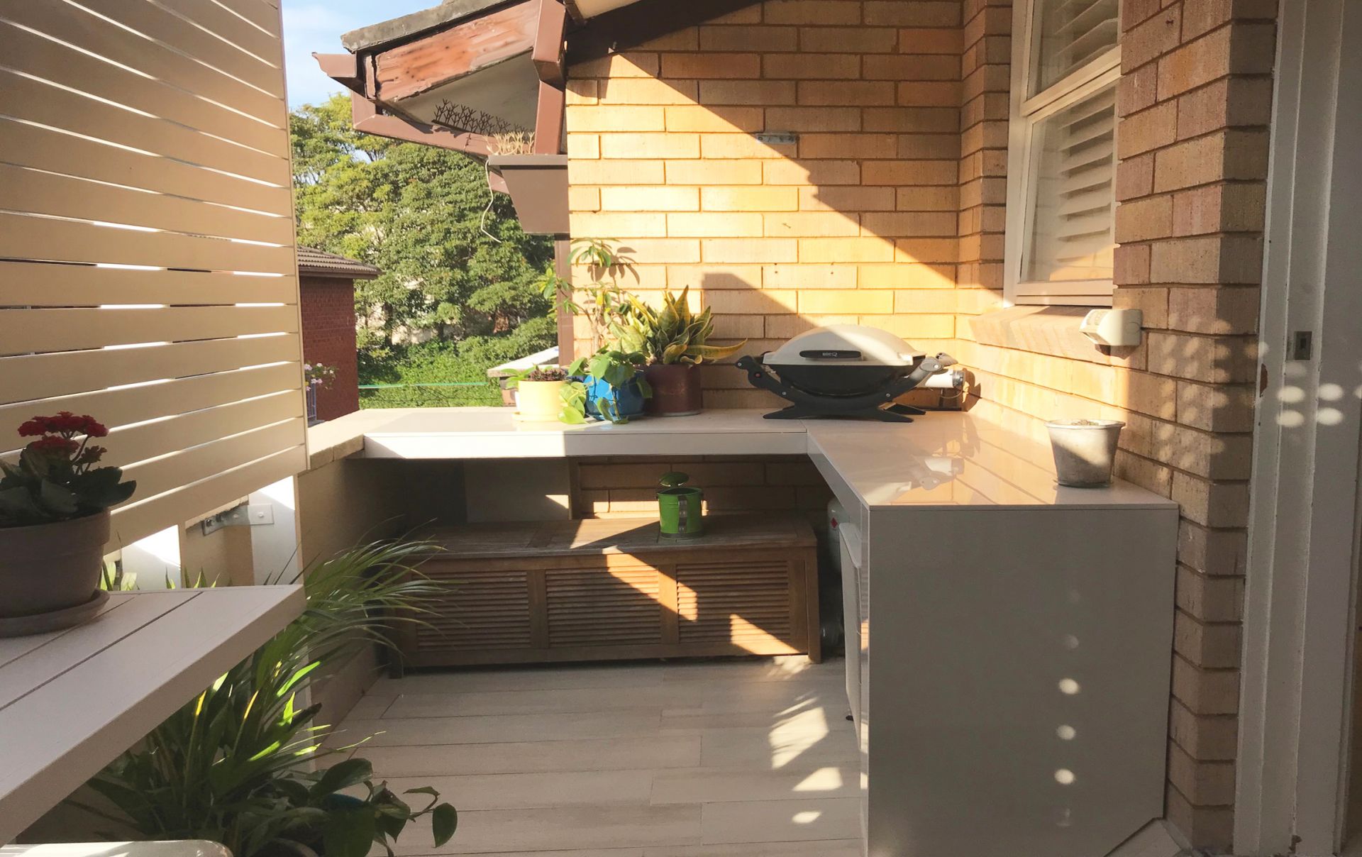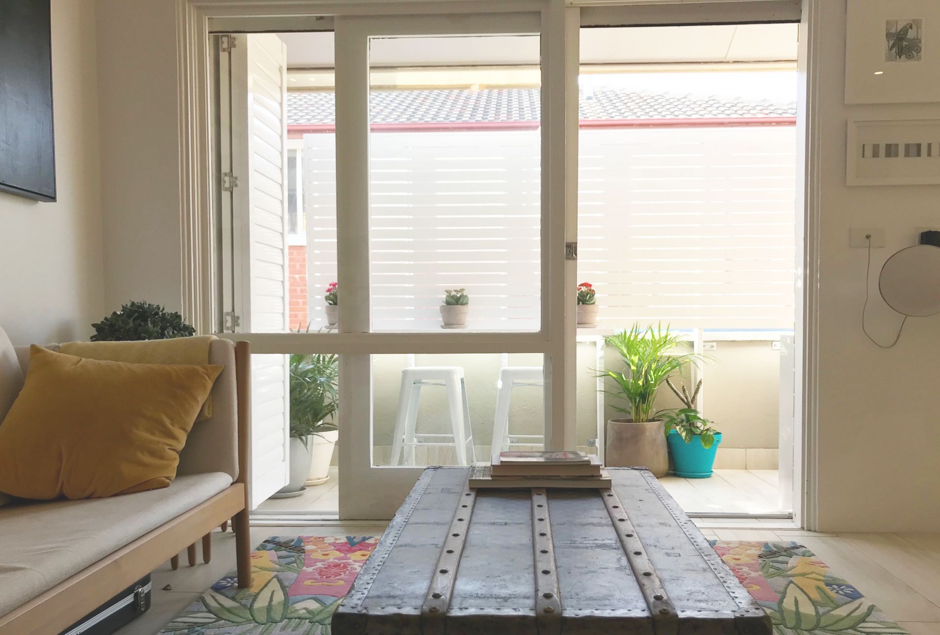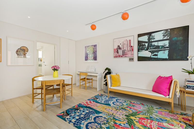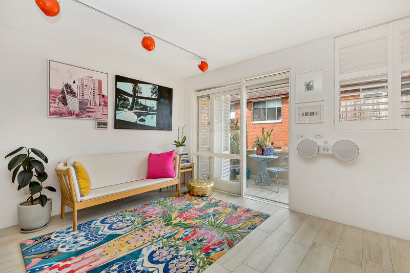 The living room is bathed with the eastern morning suns and opens up onto a balcony with privacy screens perfect for breakfast on the weekends or a beer after work.