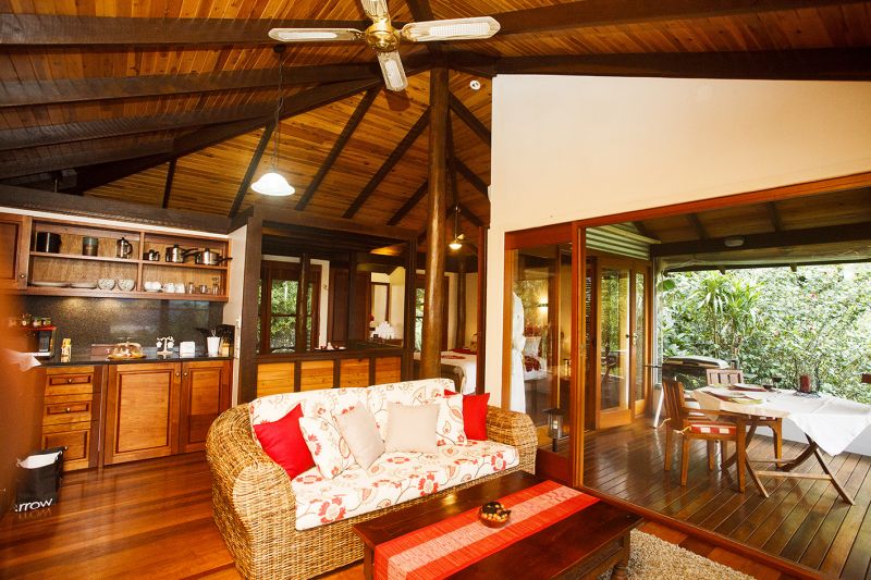 The property has been designed to be as low maintenance as possible, combining natural Rainforest areas, with easy care landscaped gardens, winding bitumen roads to the cottages, fenced horse paddock and arena. There is a huge storage shed for property maintenance and comes with a John Deere 4wd ride-on mower and Stihl garden equipment. There is a back-up generator in the event of power outage. Water supply consists of a full flow bore, ensuring permanent water for the 36,000 litre storage tank. In addition the property comes with 2 work vehicles; (cleaning van and check-in car). Solar power also supports the property, keeping power bills low.