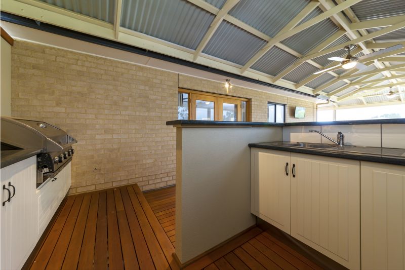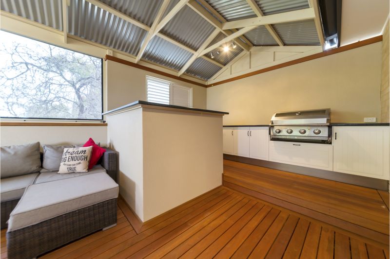 - Large outdoor kitchen with built-in barbeque, ample cupboard space and sink