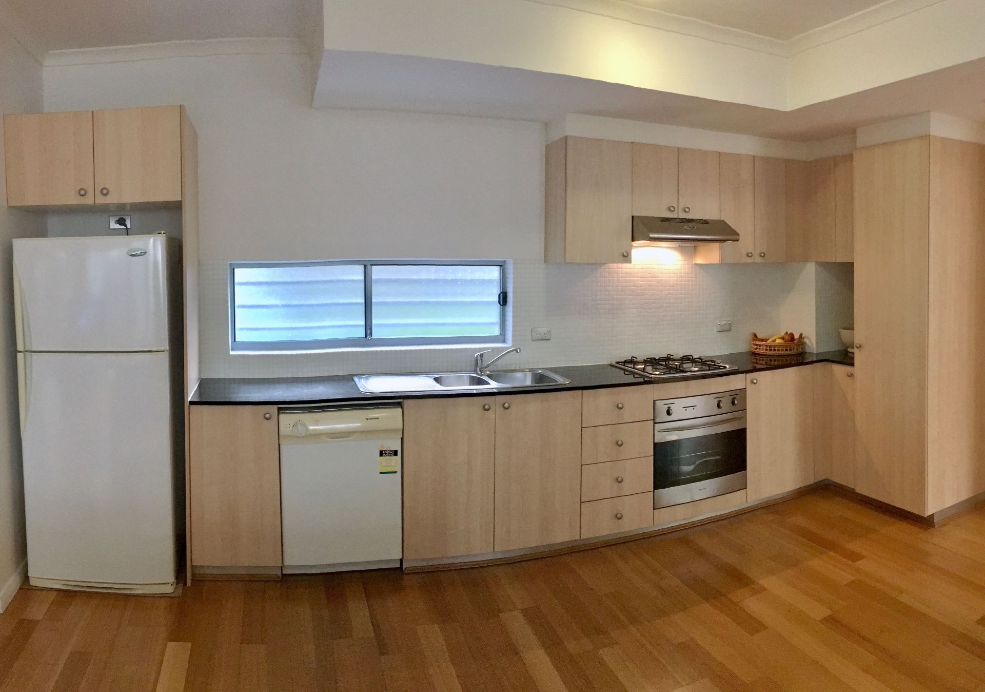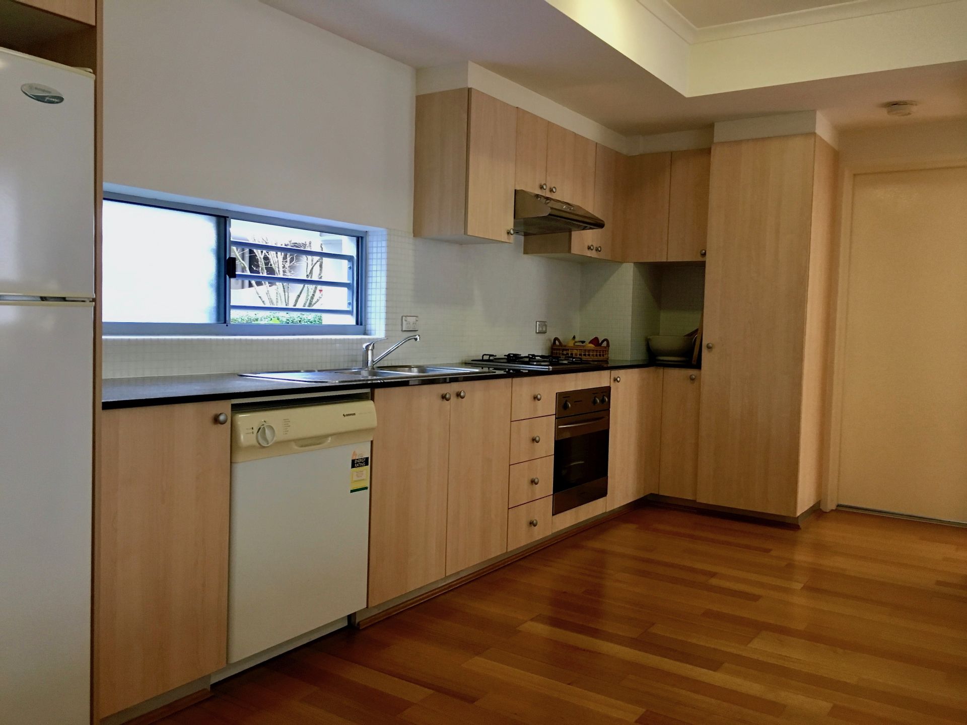 * Galley style kitchen with granite bench tops