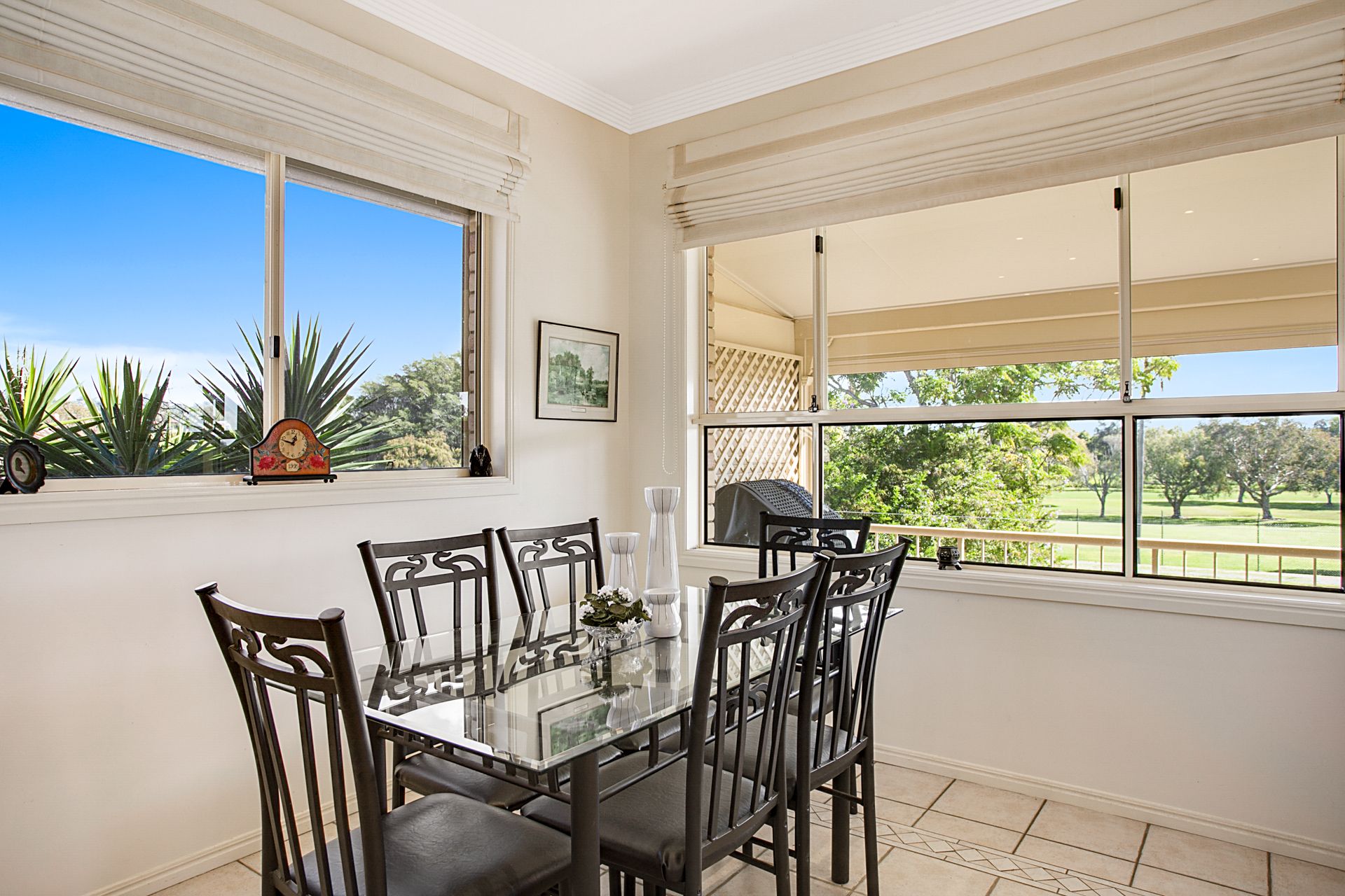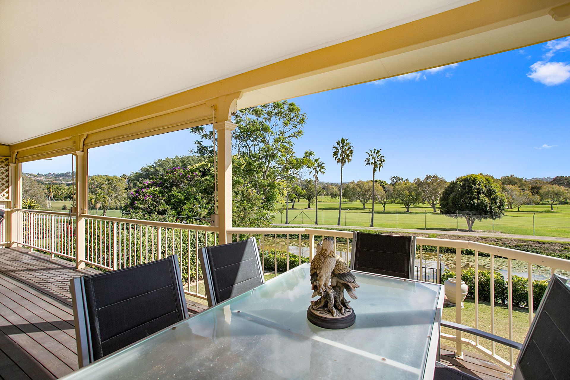 Sliding doors open out to the expansive covered deck. Here, roll-down blinds allow year-round entertaining, but with gorgeous views over the canal and out to the pristine fairways of the golf course, you'll want to keep the blinds up at any chance.