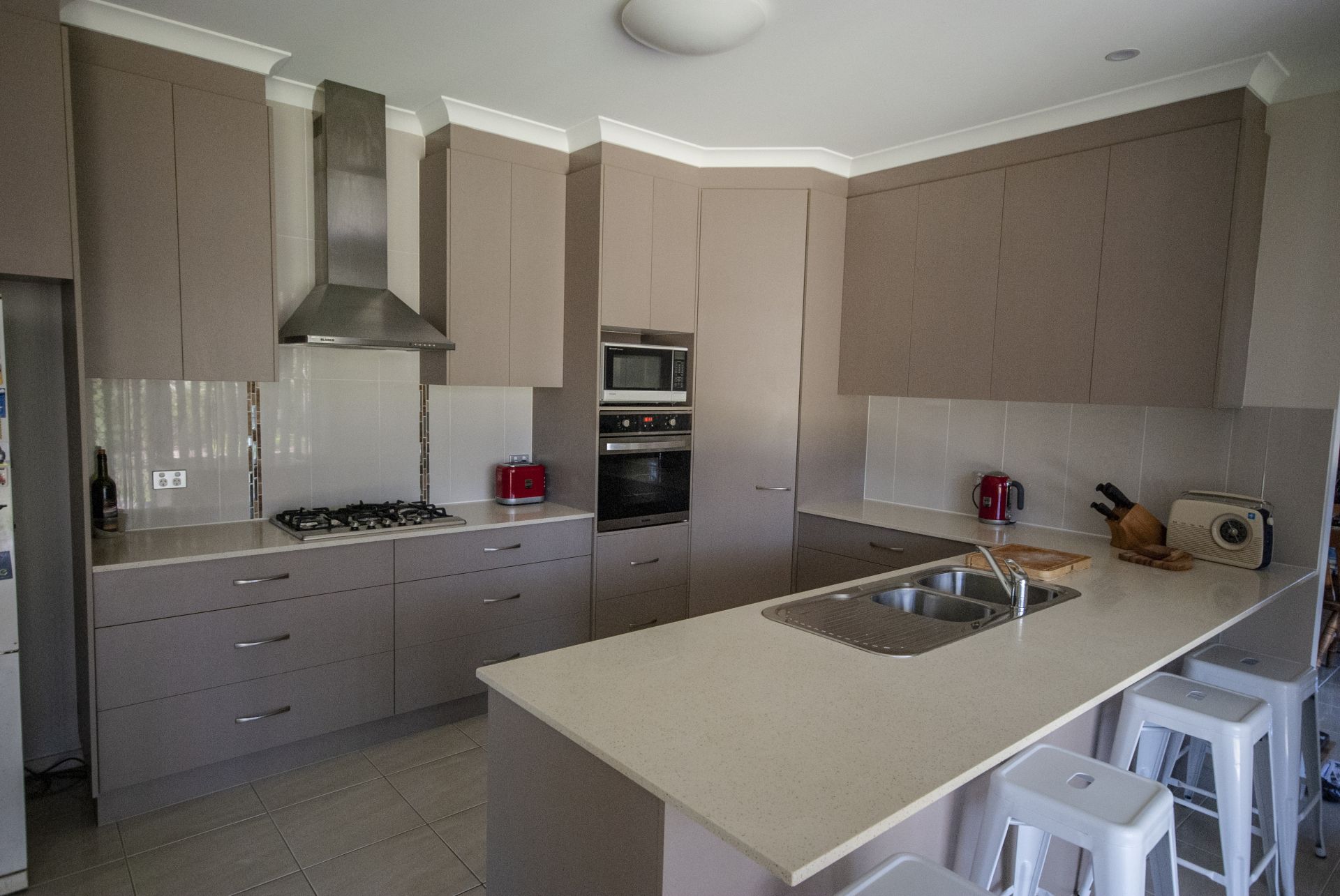 Kitchen has stone top benches, soft close cupboards and draws.