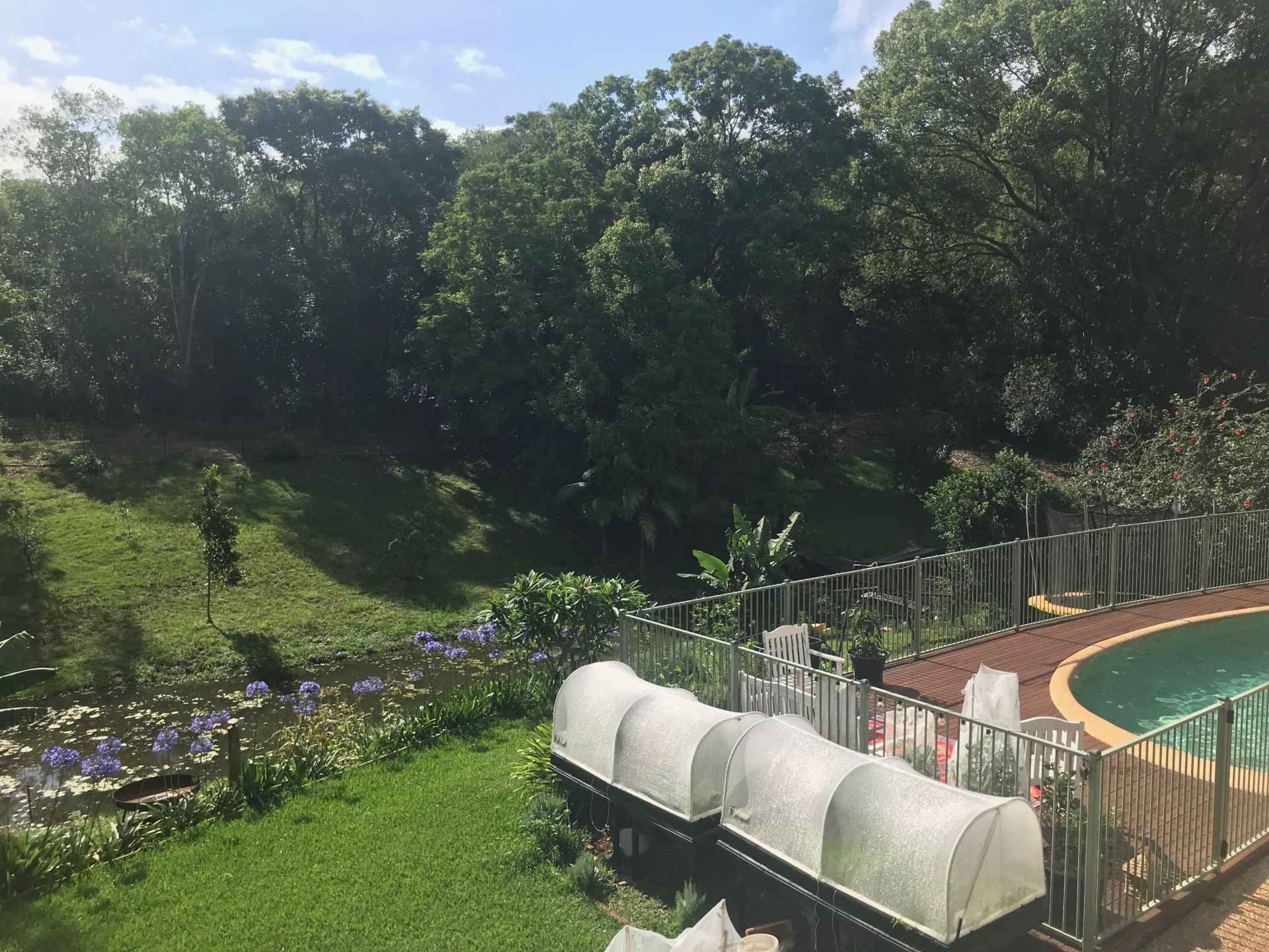 Number 18 is very private , tucked away down a driveway and out of sight from the other homes on the Estate. It boasts one of the largest and most private blocks with a natural rainforest surround. The home has 4 large bedrooms all with built in robes , the main bedroom has a walk in wardrobe and ensuite with shower. Three bedrooms have air-conditioning and one has ceiling fans and access to the rear deck . Number 18 boasts a flexible floor plan with 2 living areas and a dining room , which are easy to change around should you wish. The original country kitchen is the heart of the home with plenty of space to whip up all your favourite feasts , then serve them up on the deck over looking the pool and watch the sun go down .....bliss! If you work from home or are a musician /artist or just want a quiet space to read a book , the original office space was soundproofed a year ago for recording purposes and air conditioning installed for comfort. The home also has a large concrete rainwater tank and solar hot water .The salt water pool is large and includes a pool cover and robotic cleaner and looks over the wonderful gardens.